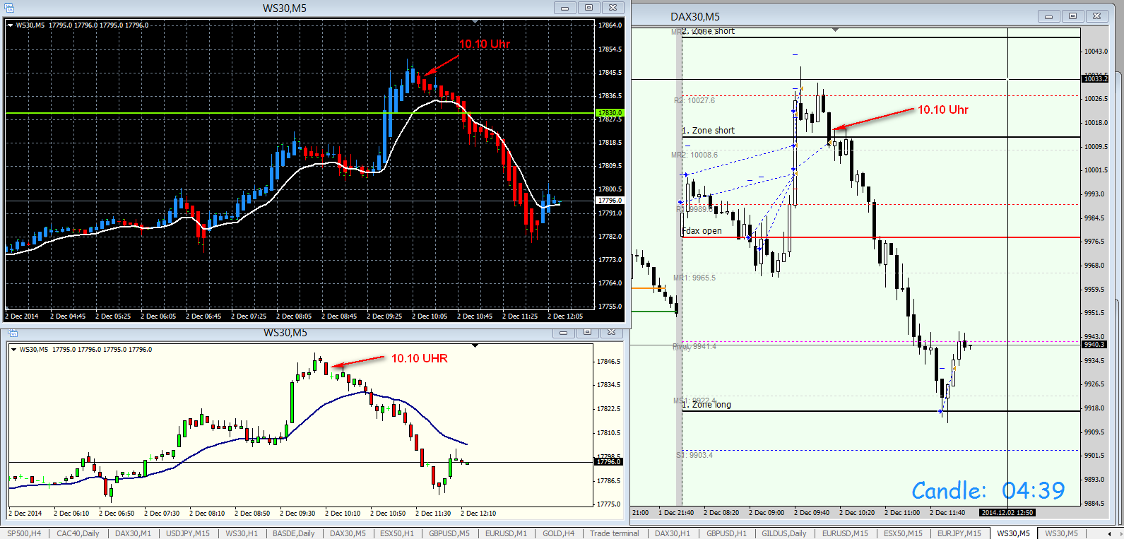 Um 10.10 Uhr zeigten Dow 5min und Dow 5min Heikin Ashi und Dax short an der 1. Zone short an !
