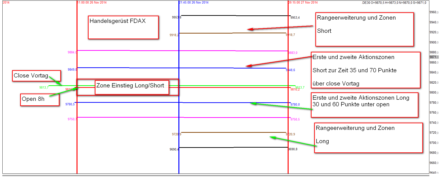 Angefügtes Bild liegt ausgedruckt neben dem Rechner. Handeln an den Rändern. Geduld aufbringen und nicht innerhalb der Zonen einsteigen. Vormittagshandel war gut aber die Umkehr an 1. Zone short war ein " muss " -