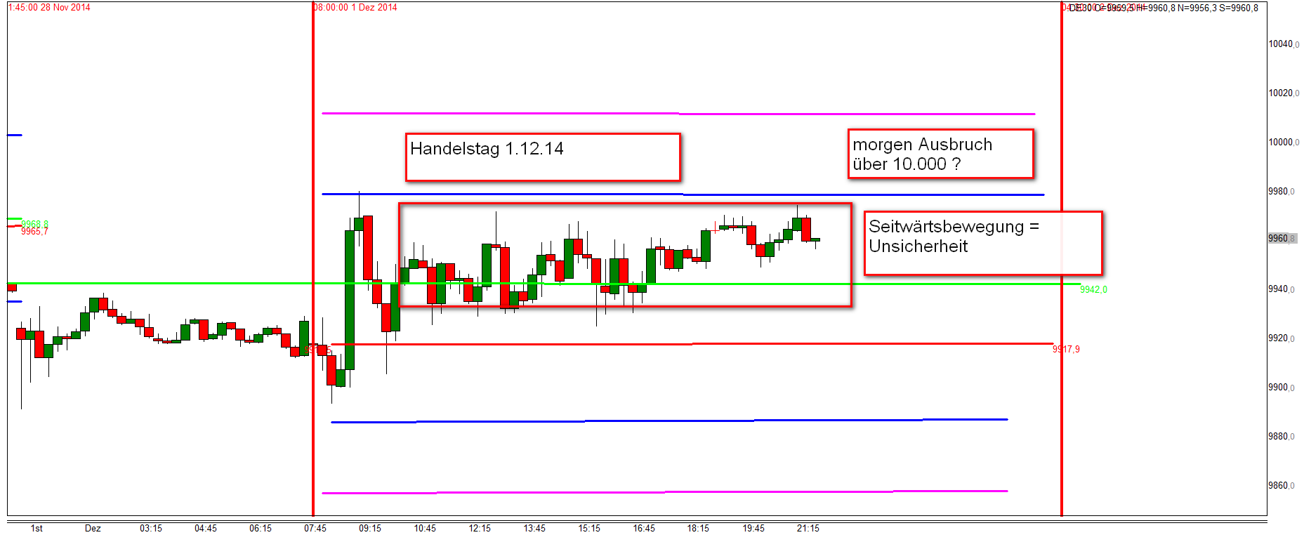 was mich wirklich wunderte war, dass Horst an der ersten Zone mit Limit einstieg. Bei der frühmorgentlichen Vorbereitung gehört unbedingt die Information über anstehende Veröffentlichungen: 09:30 DE Dienstleistungsindex November und 09:30 DE Einkaufsmanagerindex verarb. Gewerbe November. Diese negative Mitteilung hat den Kurssturz begleitet mit allen Stopp Losses verursacht. Habe für solche wichtigen Nachrichten immer den Finger am Trigger um mit dem Trend zu traden. Liebe derartige WRB weil diese, sobald alle sleeping orders ausgeführt wurden, sofort mit einem langen Docht zurückschnellen und wiederum für einen Einstieg genutzt werden können.