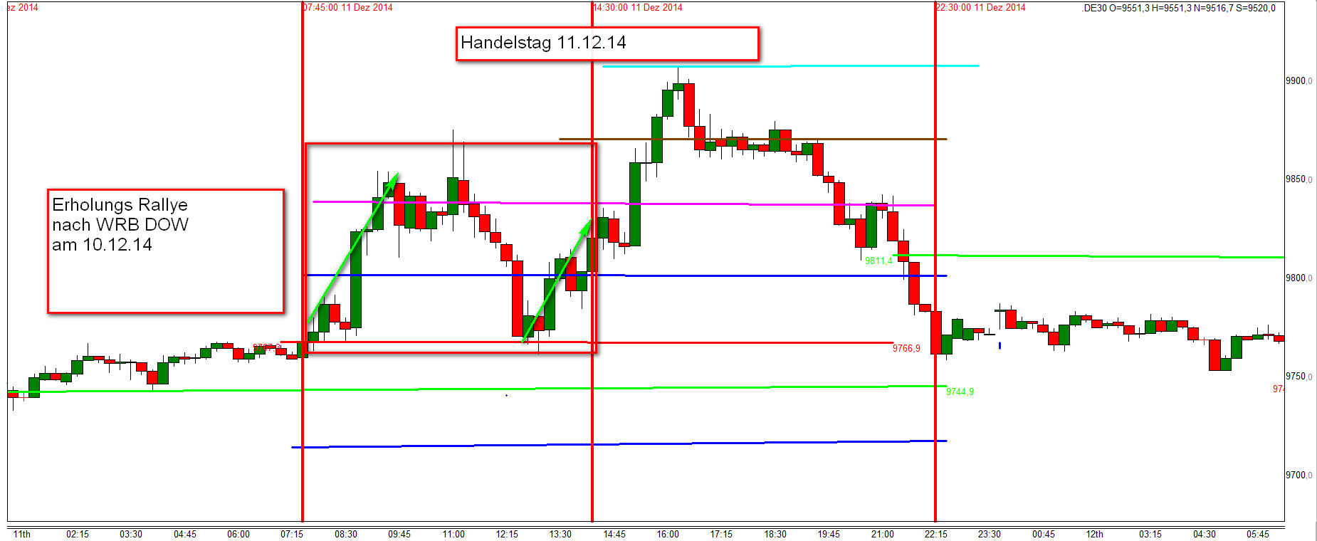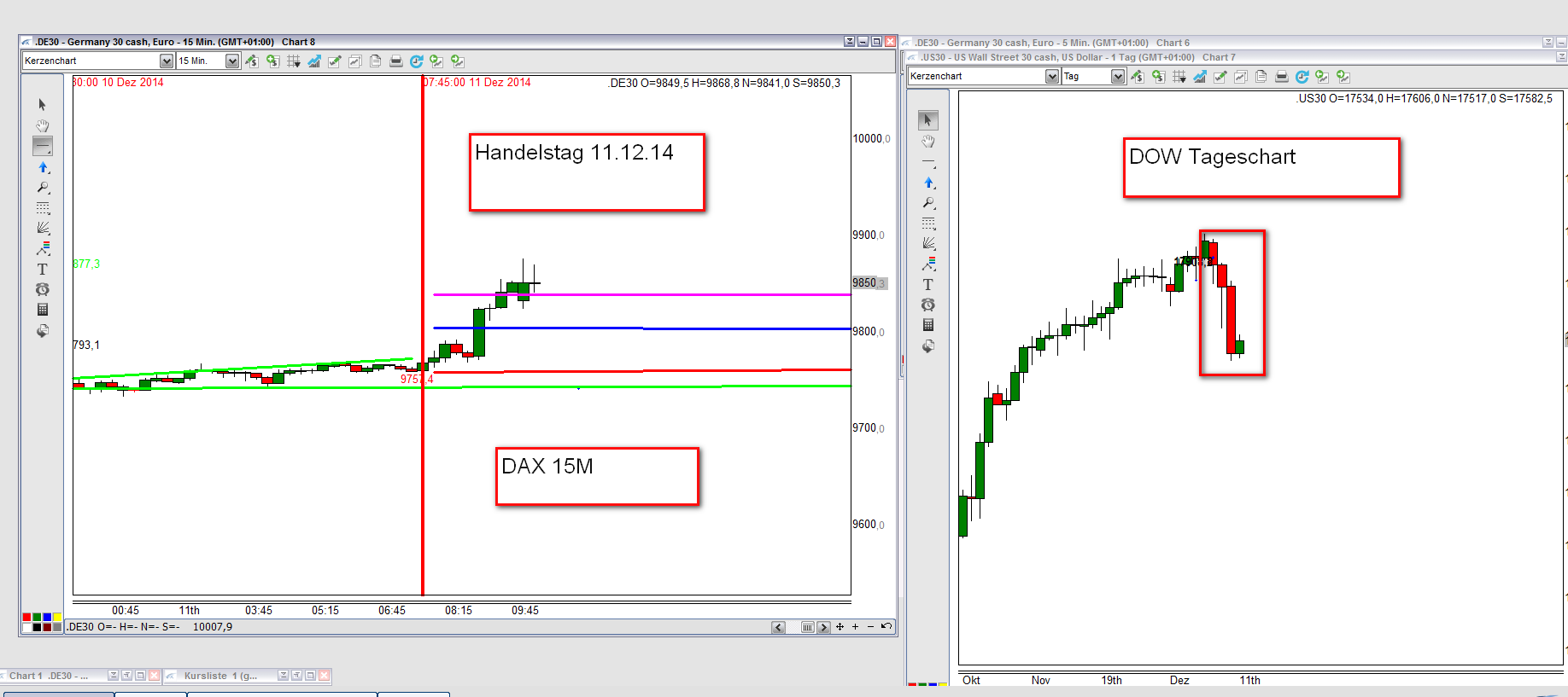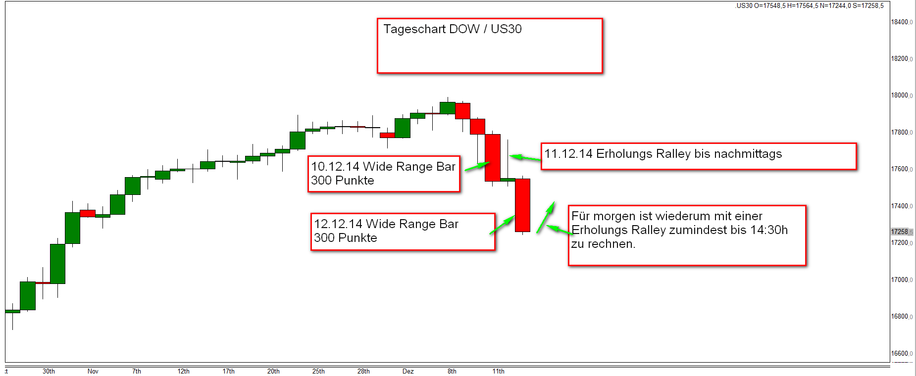 Es ist zu empfehlen am Wochenende die vergangene Handelswoche zu analysieren um daraus Rückschlüsse zu ziehen und Erkenntnisse zu sichern. Betrachten wir den DOW/US30 Tages- und den FDAX/German 30 15M Charts und konzentrieren uns ausschließlich auf den Handel bis 14:30 h. Trotz aller negativen Nachrichten konnten bis 14:30h regelmäßig mit Long Positionen an der ersten und zweiten Zone long kräftig Punkte gesammelt werden. Am 11.12.14 mit einer sich abzeichneten Erholungs Rallye sogar nach Eröffnung. Gemäß dem eingefügten Chartbild DOW/US30 ist morgen mit Wahrscheinlichkeit auch mit Longpositionen Geld zu verdienen. Je nach Entwicklung der DJIA FUT diese Nacht bereits mit dem Eröffnungskurs oder noch besser mit einem frühen schnellen Rückzieher und kräftigen Snap Back !