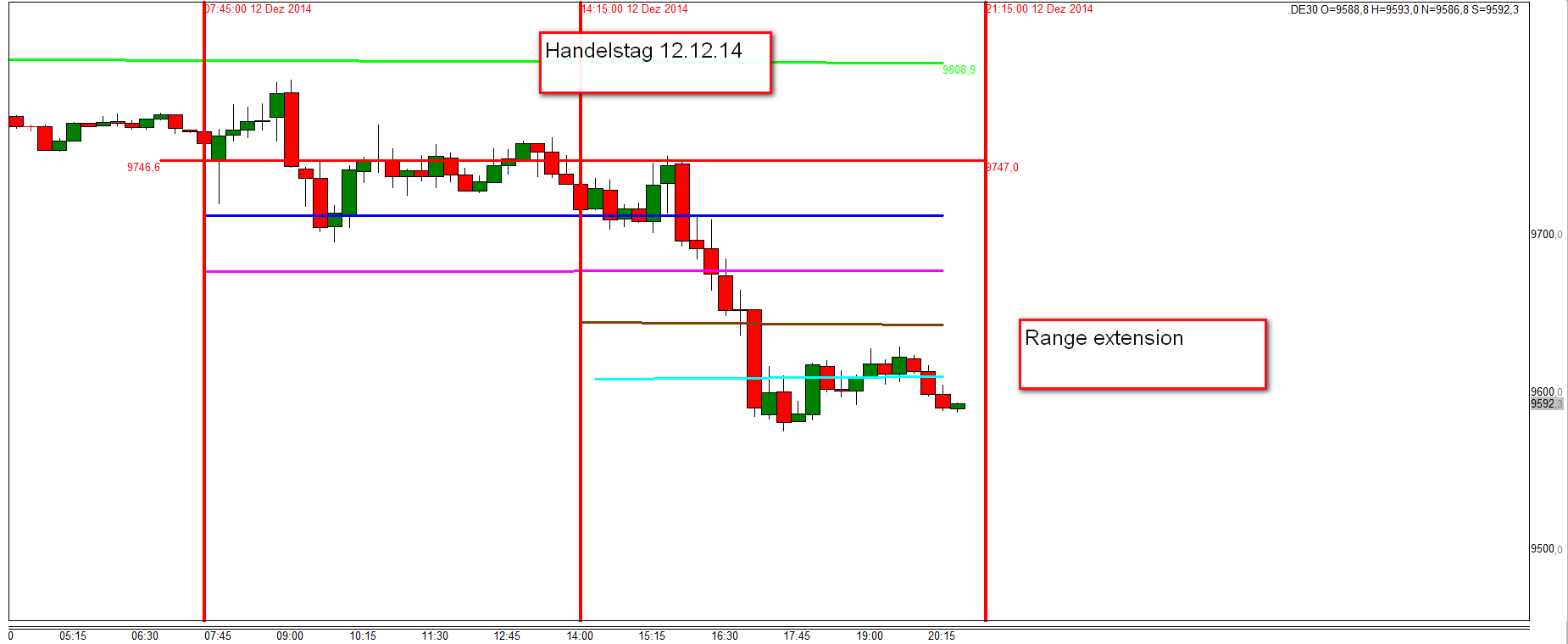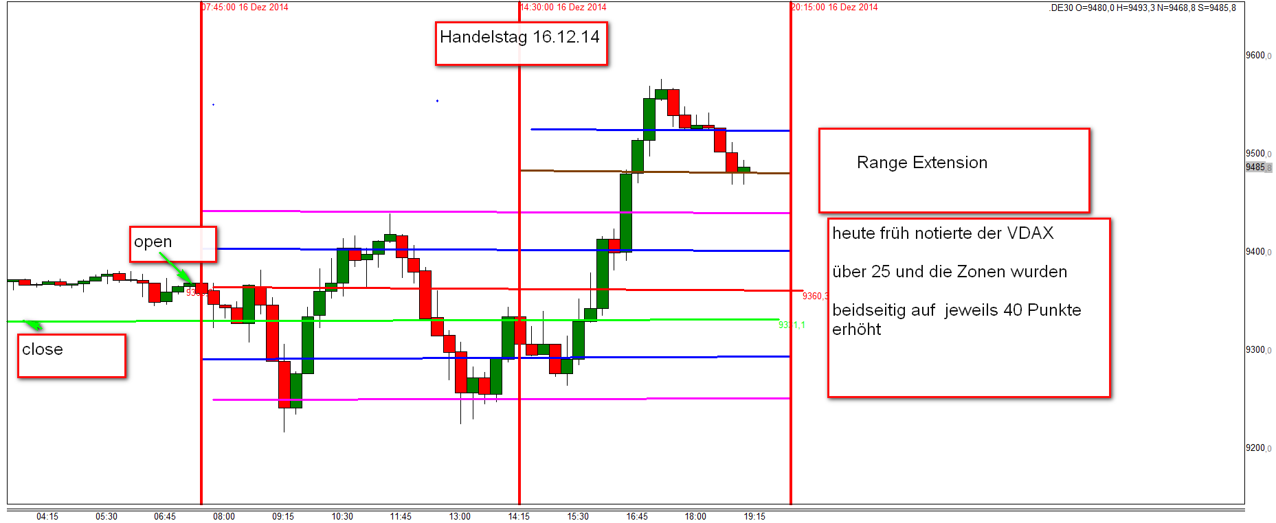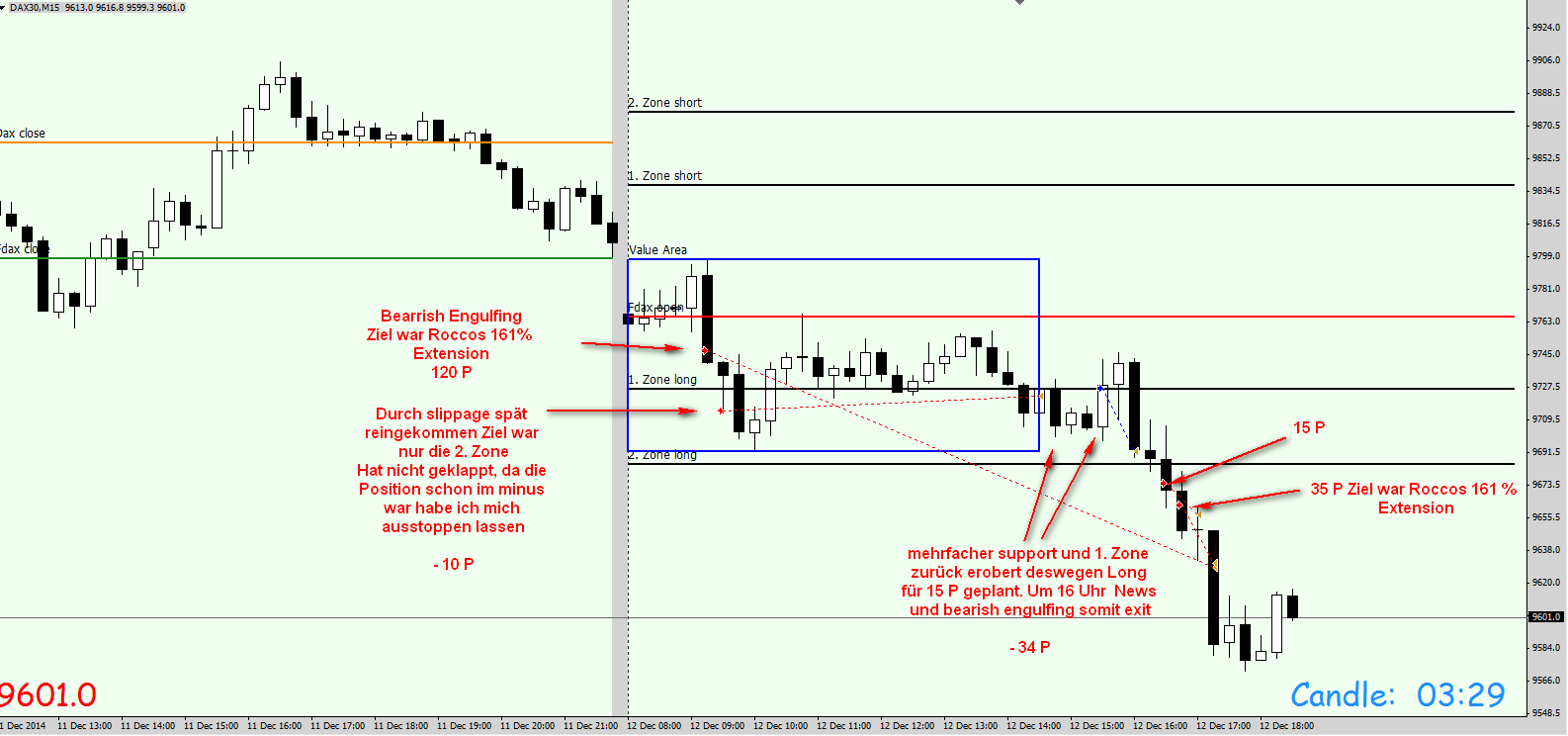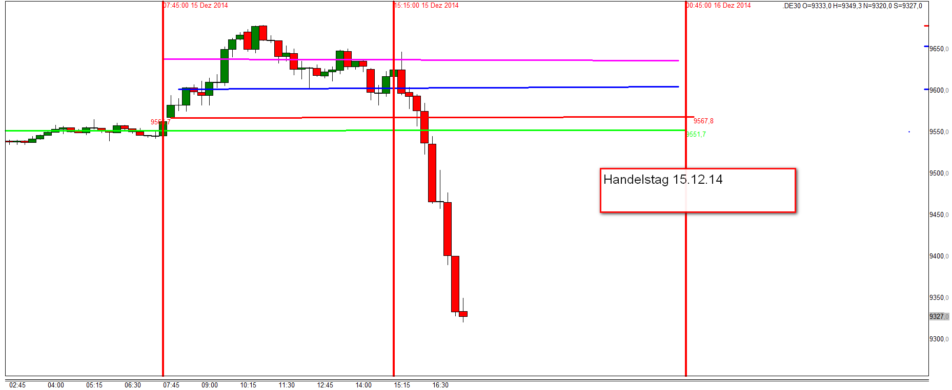 Es ist zu empfehlen am Wochenende die vergangene Handelswoche zu analysieren um daraus Rückschlüsse zu ziehen und Erkenntnisse zu sichern. Betrachten wir den DOW/US30 Tages- und den FDAX/German 30 15M Charts und konzentrieren uns ausschließlich auf den Handel bis 14:30 h. Trotz aller negativen Nachrichten konnten bis 14:30h regelmäßig mit Long Positionen an der ersten und zweiten Zone long kräftig Punkte gesammelt werden. Am 11.12.14 mit einer sich abzeichneten Erholungs Rallye sogar nach Eröffnung. Gemäß dem eingefügten Chartbild DOW/US30 ist morgen mit Wahrscheinlichkeit auch mit Longpositionen Geld zu verdienen. Je nach Entwicklung der DJIA FUT diese Nacht bereits mit dem Eröffnungskurs oder noch besser mit einem frühen schnellen Rückzieher und kräftigen Snap Back !