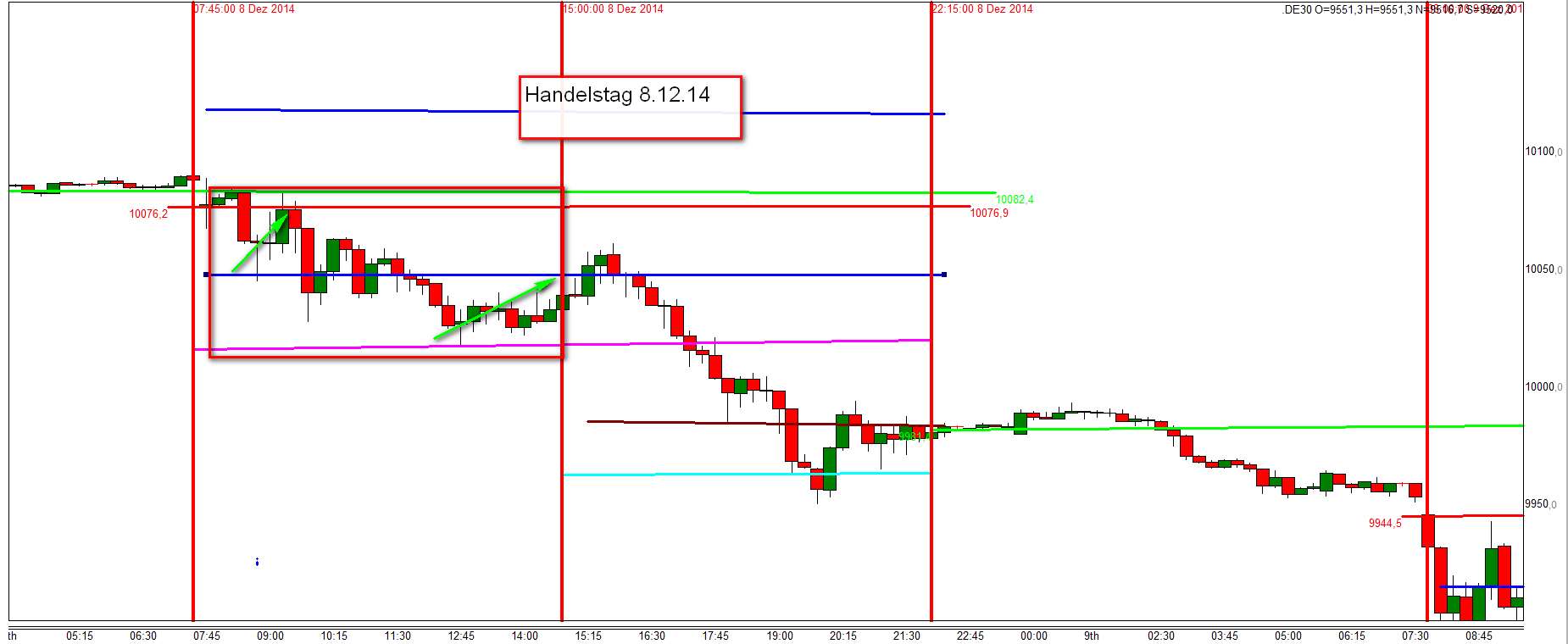 Für die Analyse habe ich eine Checkliste erstellt und beginne mit den übergeordneten Timeframes. Betrachte die Schlusskurse der fernöstlichen Börsen, DJIA FUT, VIX und VDAX. Informiere mich über spezielle Ereignisse die als Katalysatoren die Kurse bewegen können und anstehende Veröffentlichungen von Wirtschaftsdaten in EU und USA. Je nach Vorgaben wird der Börsenbeginn um 8/9h als neutral, negativ oder positiv bewertet. Bei sehr negativen/positiven Vorgaben werden Positionen bereits innerhalb 8-9:15h eröffnet. Bei neutralen Vorgaben werden die Aktionszonen abgewartet.