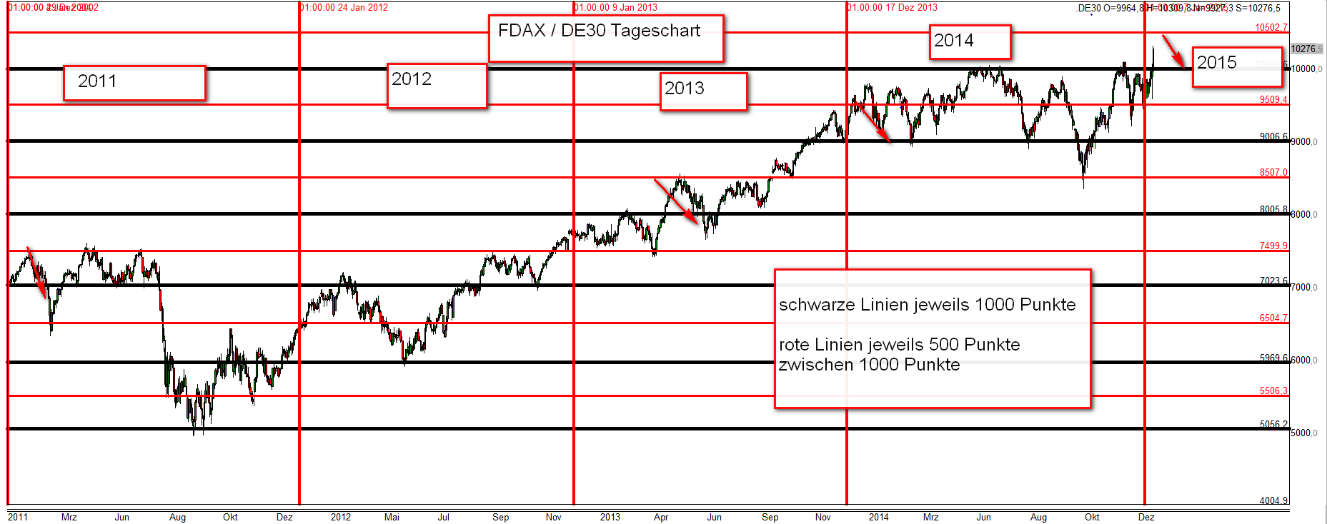 Jedes Mal wenn der Dax ein neues Hoch an der 1000 und 500 Punkte-Linie markiert denke ich an Positionstrading und trade nach meiner Dauershort- Handelstrategie. Eine Shortposition wird bis zu mindest 500 Punkte nach unten gehalten. An speziellen Tagen wird diese mit einer Longposition neutralisiert. Nach einem erheblichen Intraday Dax Verlusttag wird nach einem von den DJIA FUT eingeleiteten Reversal neben der Shortposition eine größere Longposition eröffnet. Das gilt auch für eine doppelte Kurslücke nach oben. Gewöhnlich wird jedoch zum Schlusskurs eine noch bestehende Longposition glatt gestellt.