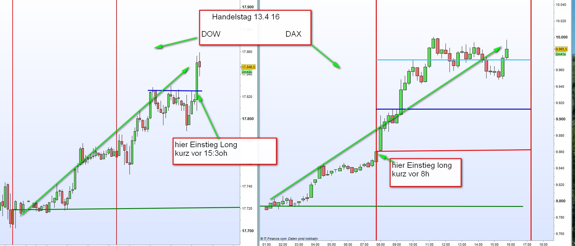 Nach einem Trendtag wie der gestrige gibt es am nächsten Tag meistens eine Fortsetzung insbesondere wenn Asien, so wie heute, hervorragende Vorgaben liefert. Bei derartigen positiven Bedingungen steige ich gerne morgens kurz vor 8h mit dem DAX kurz vor 15:30h mit DOW ein. Eingefügt noch die verbleibende Position DOW. Alle Positionen wurden nun geschlossen.