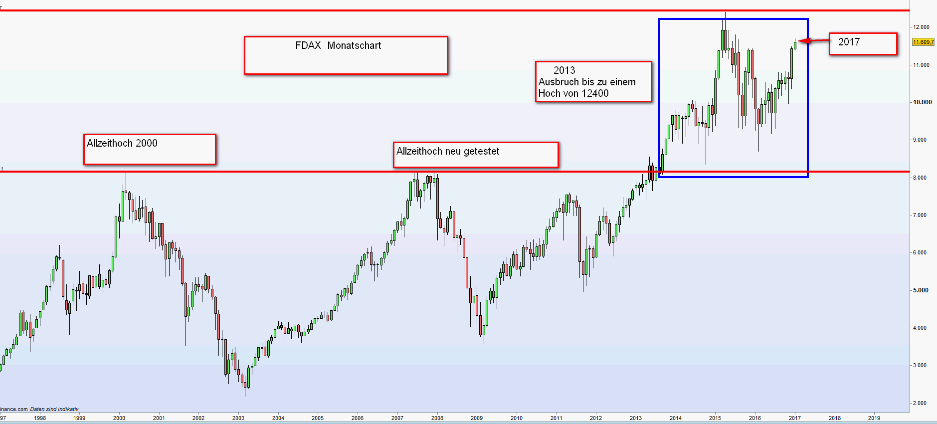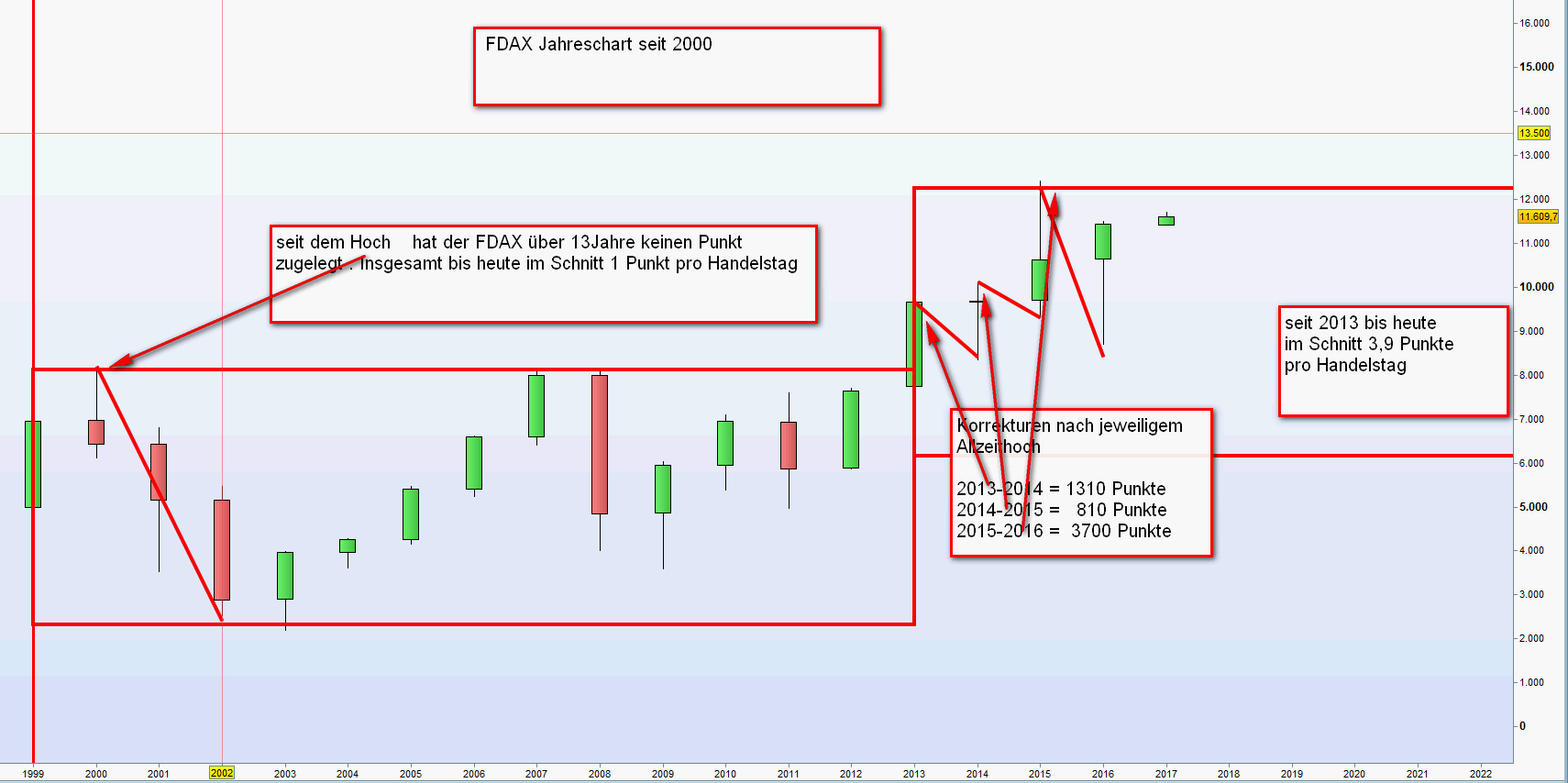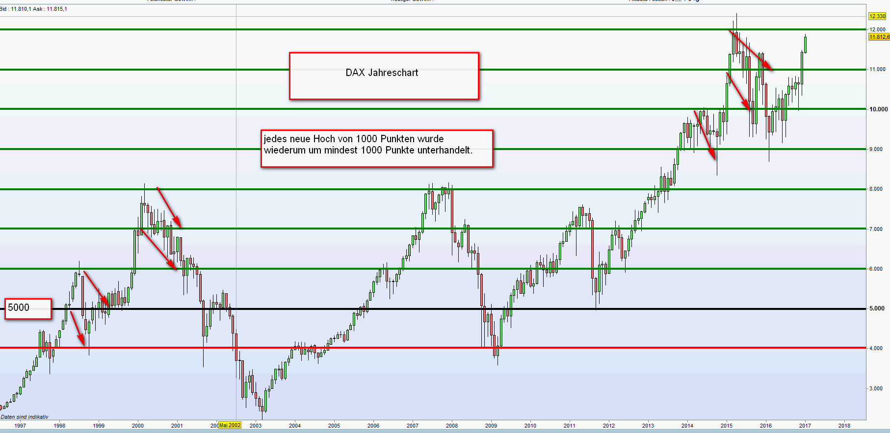 Die Betrachtung der Langzeitcharts und die Erkennung von historischen Chartmuster fasziniert mich immer wieder. Insbesondere wenn man daraus Handels-Strategien ableiten kann. Eingefügt noch einmal der DAX-Jahreschart seit 1997 mit einer gewählten Benchmark von 5000. Nach jedem Allzeithoch von plus 1000 Punkten korregiert der Kurs zwar nicht direkt aber infolge um mindest 1000 Punkte.