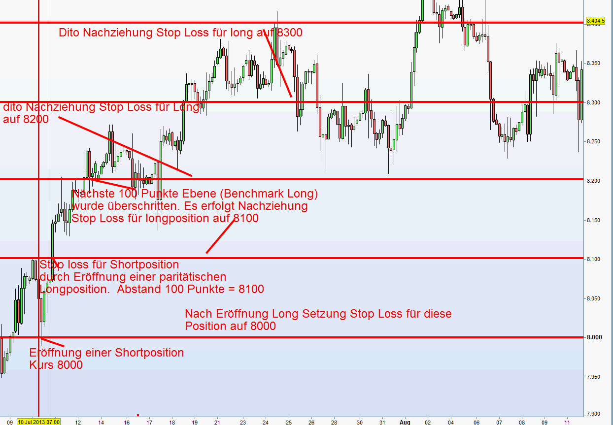 Nach einer Positionseröffnung, im angefügten Chart 1 recht ungünstig bei 8000, wird für diese Position ein Stop Loss auf 8100 gesetzt und zwar durch Eröffnung einer paritätischen Longposition. Wird diese Marke von 8100 durchgehandelt und eine Longposition eröffnet dann ensteht ein Initialverlust von 100 Punkten. Diese Longposition wird wiederum nach unten abgesichert. In diesem Fall auf 8000. Ergibt es sich, dass der Kurs weiter steigt wird die Longposition im Trail Verfahren jeweils 100 Punkte höher abgesichert. Im Chart 1 wurden somit zunächst 200 Punkte long erzielt. Im Chart 2 werden kurz vor dem Allzeithoch 300 Longpunkte erzielt. Danach fiel der Kurs um 3700 Punkte!!!