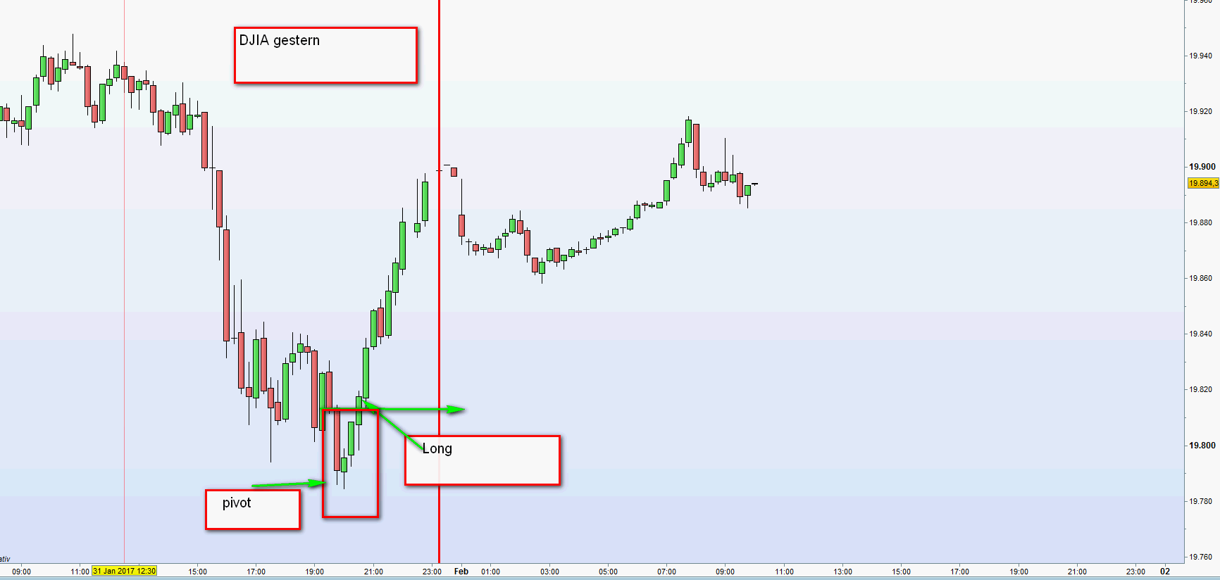 Trotz der vorherigen simplen Darstellung von 450 Verlustpunkten sind diese aufgrund des mehrfach erklärten Stopmanagements nicht eingetreten denn es wurden damit 600 weitere Longpunkte erzielt. Siehe Rechtecke im Chart. Also schon ein Nettogewinn. Weiterhin eröffnet der Kurs wie heute unter dem Close vom Vortag mit einem zusätzlichen Gewinn.