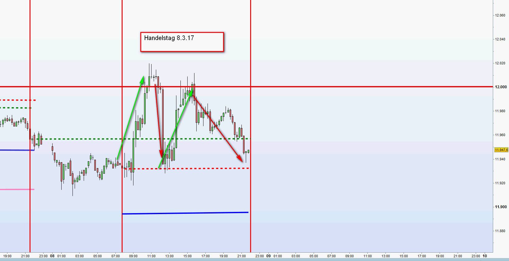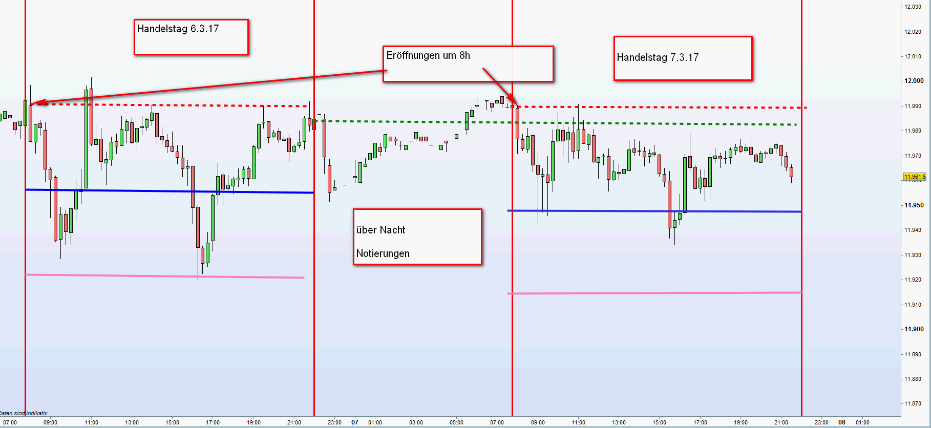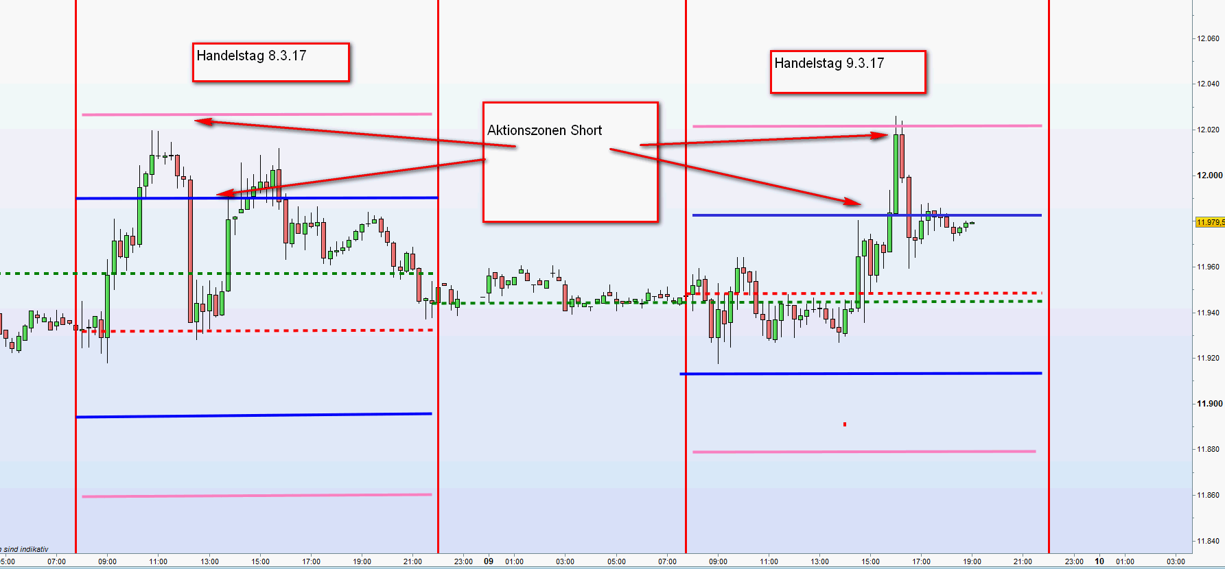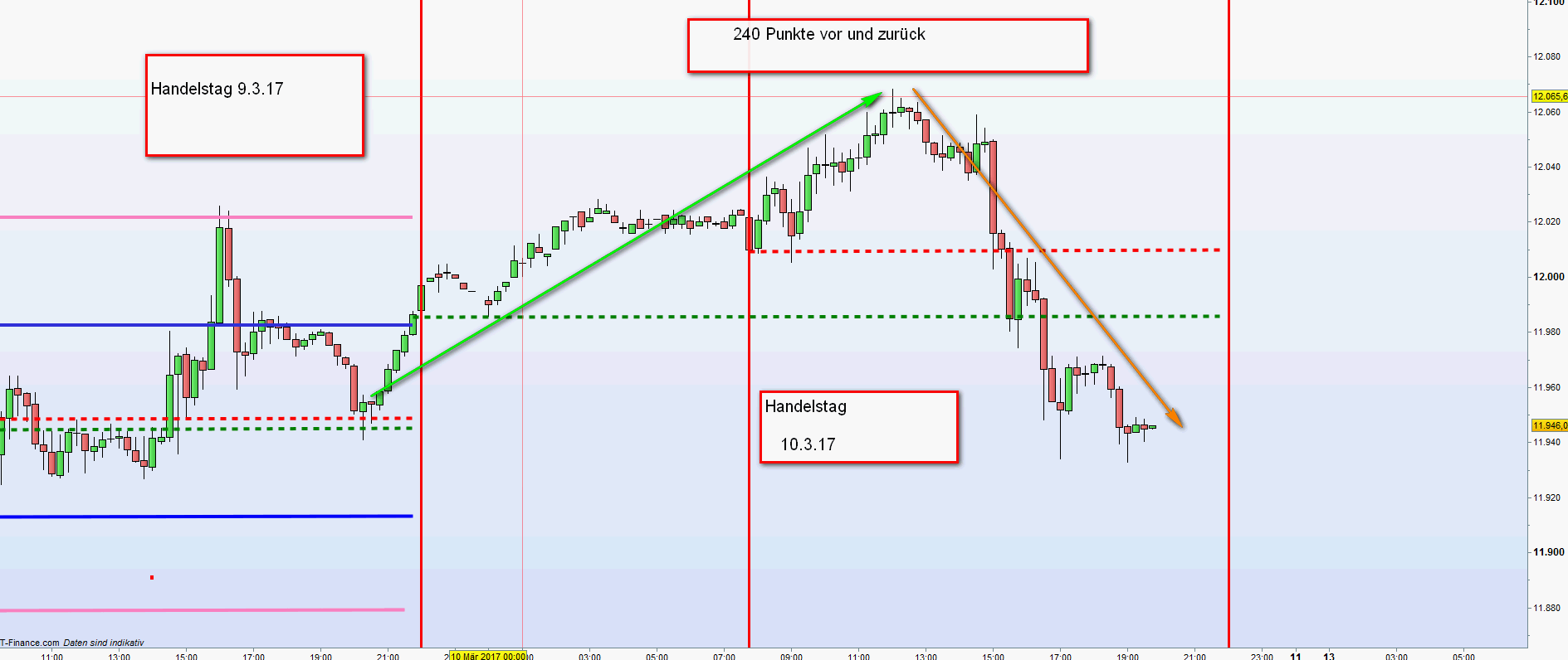 Dieser Handelsansatz erfordert Präsenz, Fokus an den Aktionszonen und Verständnis für Price Aktion auf dem ansonsten nackten Chart. Das ist was ich meinte Kriterien der FDAX-TRADING-STRATEGIE