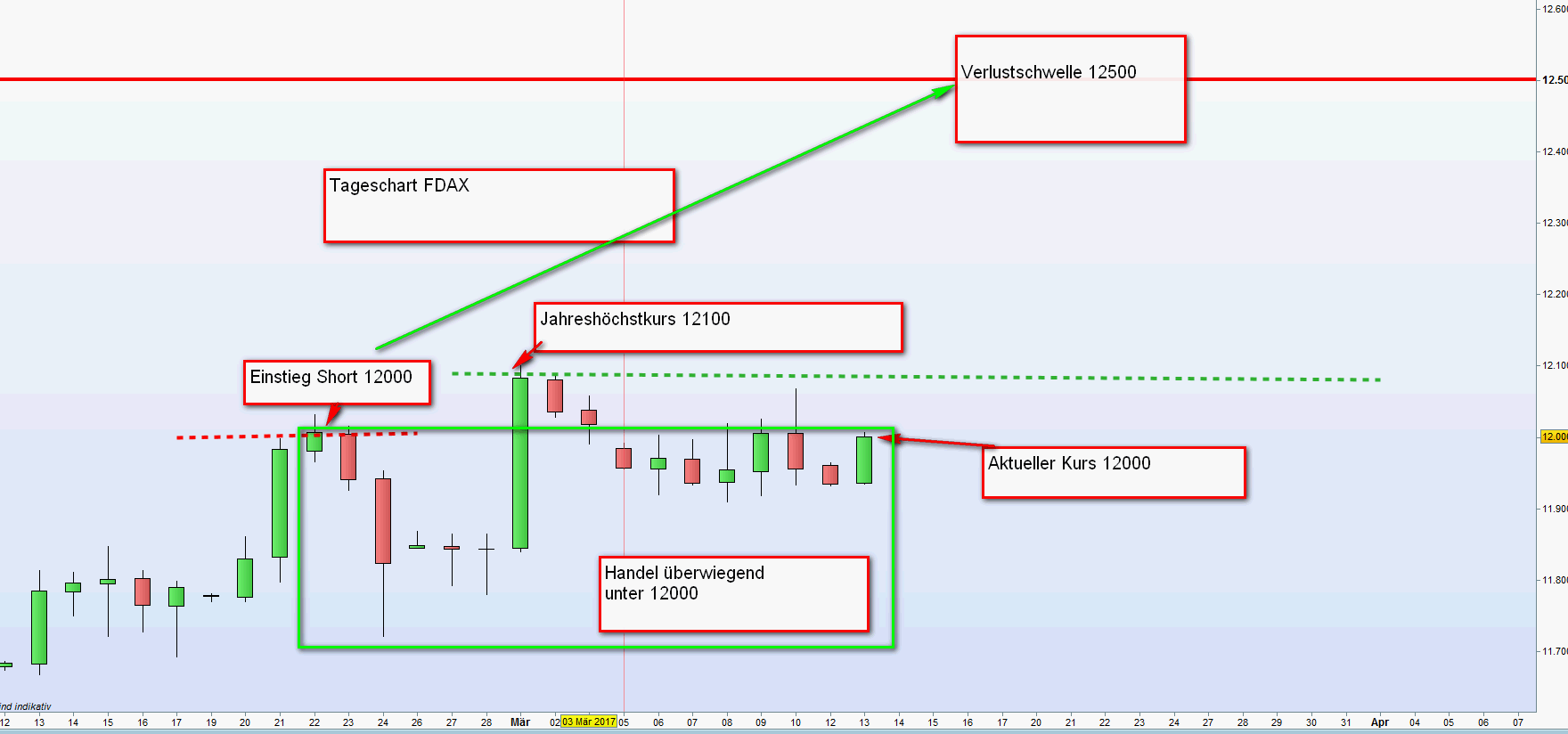 Angefügt Tageschart. Seit dem 22 Februar sind 13 Handelstage vergangen. In der Berichtszeit wurde der FDAX 11 Tage unter dem Einstiegskurs gehandelt. Angenommen es wären in dieser Zeitspanne nur 300 Punkte Gewinn erzielt worden, dann würde die Verlustschwelle bei 12500 notieren. Bei Anwendung der Regeln gemäß der Strategie Endloskontrakt Short ist ein Verlust ohne ganz grobe Schnitzer nicht mehr möglich. Präsenz am Bildschirm und Stopmanagement vorausgesetzt.