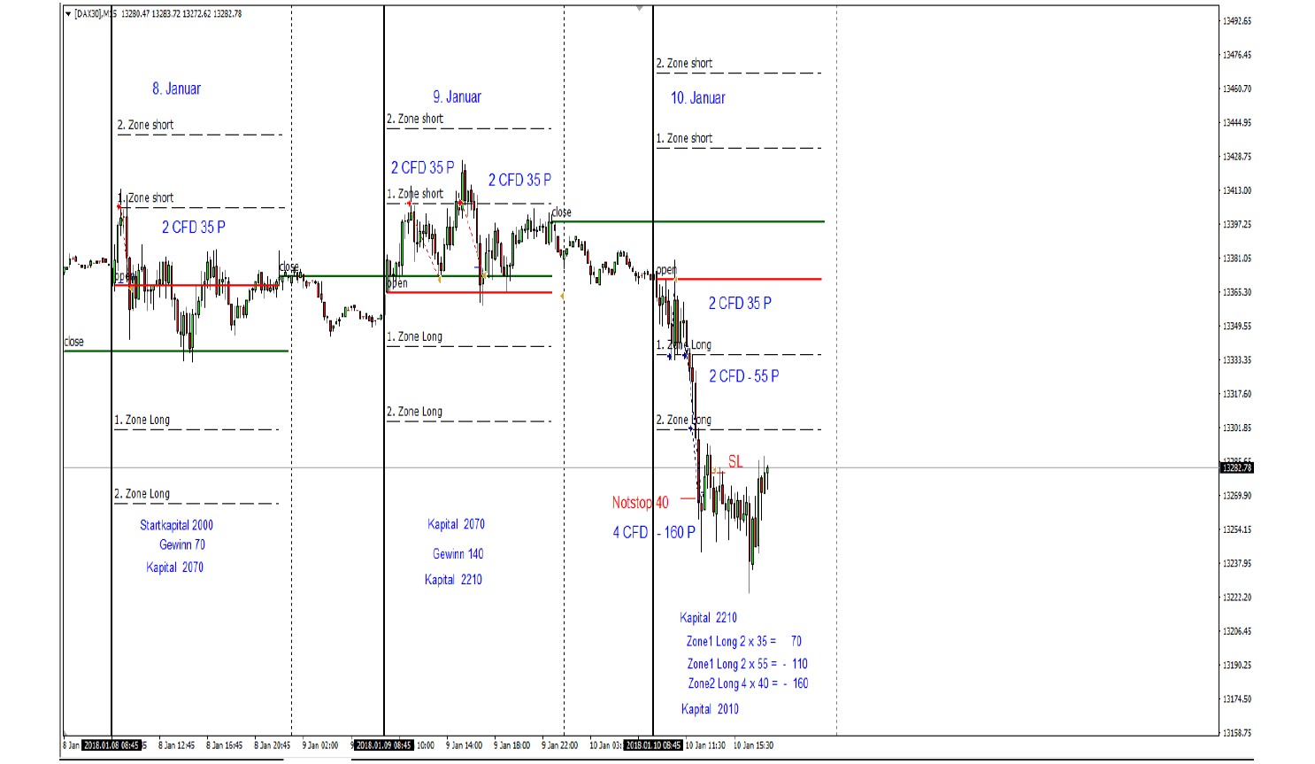Für die Berichtszeit 2017 wurden vorgenannte Basisregel etwas geändert. Insbesondere Die Verluststopps.Zeitstopp Loss wird wie folgt mit Glattstellung unter/über der zweiten Zone ausgeführt: Bei Einstieg Long oder Short zählt diese 15M Kerze als erste Kerze. Wenn dann bei drei weiteren Kerzen (dann die vierte ) ein Verlust von mehr als 20 Punkten vorherrscht wird die Gesamtposition geschlossen und der Handel für den Tag eingestellt. Max Verlust 190 € für 6 CFDs Notstopp Der Notstopp tritt dann in Kraft, wenn nach Positionseröffnunge von 2 CFDs an der ersten Zone und vier weiteren CFDs an der zweiten Zone der Kurs sofort 50 Punkte unter/über der zweiten Zone notiert. Max Verlust 370 für 6CFDs. Notstopps kommen allerdings seltener vor.Weiterhin kamen zu diesem Basisregelwerk einige Sonderregel hinzu, die alle in den Beiträgen seit dem 23.12.17 zu ersehen sind. Werde dazu noch ein PDF anfertigen. Diese haben rasant das Ergebnis verbessert.Insgesamt handelt es sich also um ein leicht umsetzbares mechanisches Regelwerk. Darüber berichte ich zur Zeit. Erlaube mir jedoch mit Kommentaren darzustellen, wie die Ergebnisse mit diskretionärem Handel verbessert werden können.