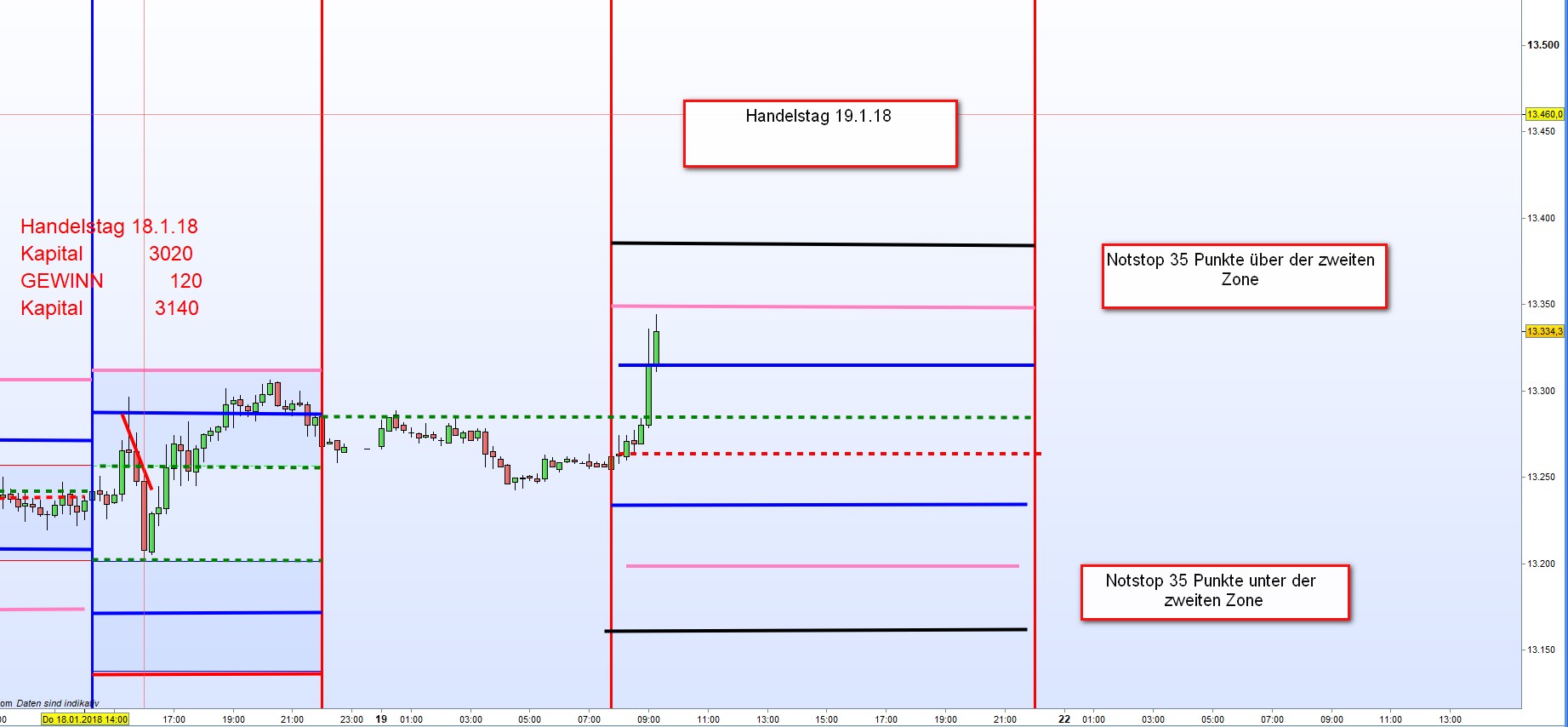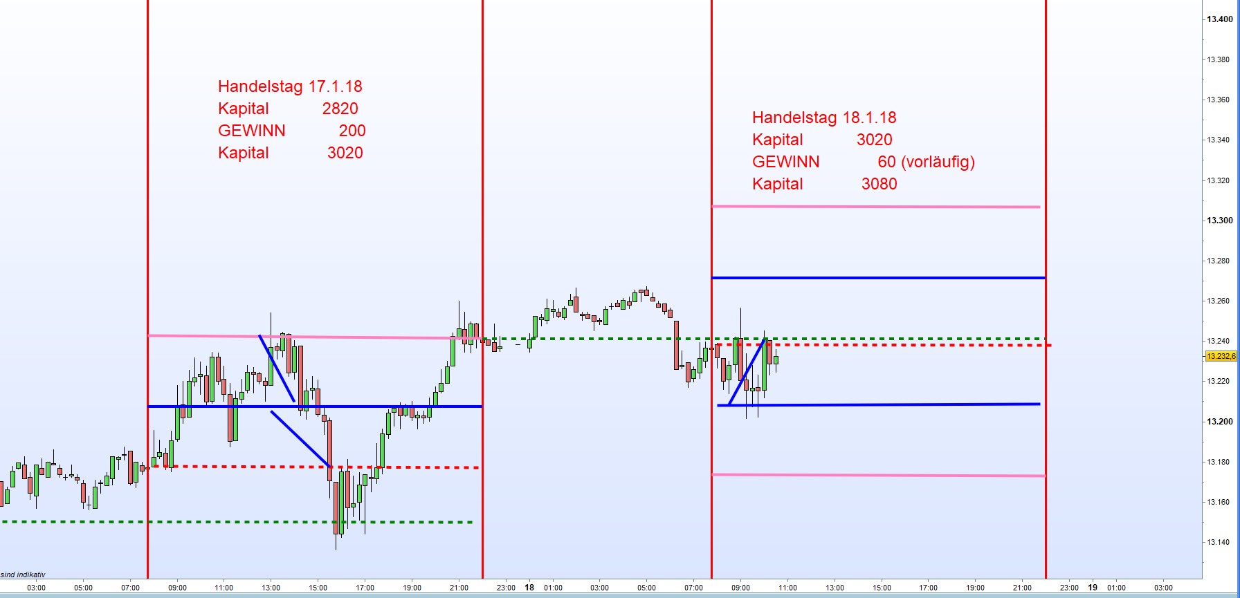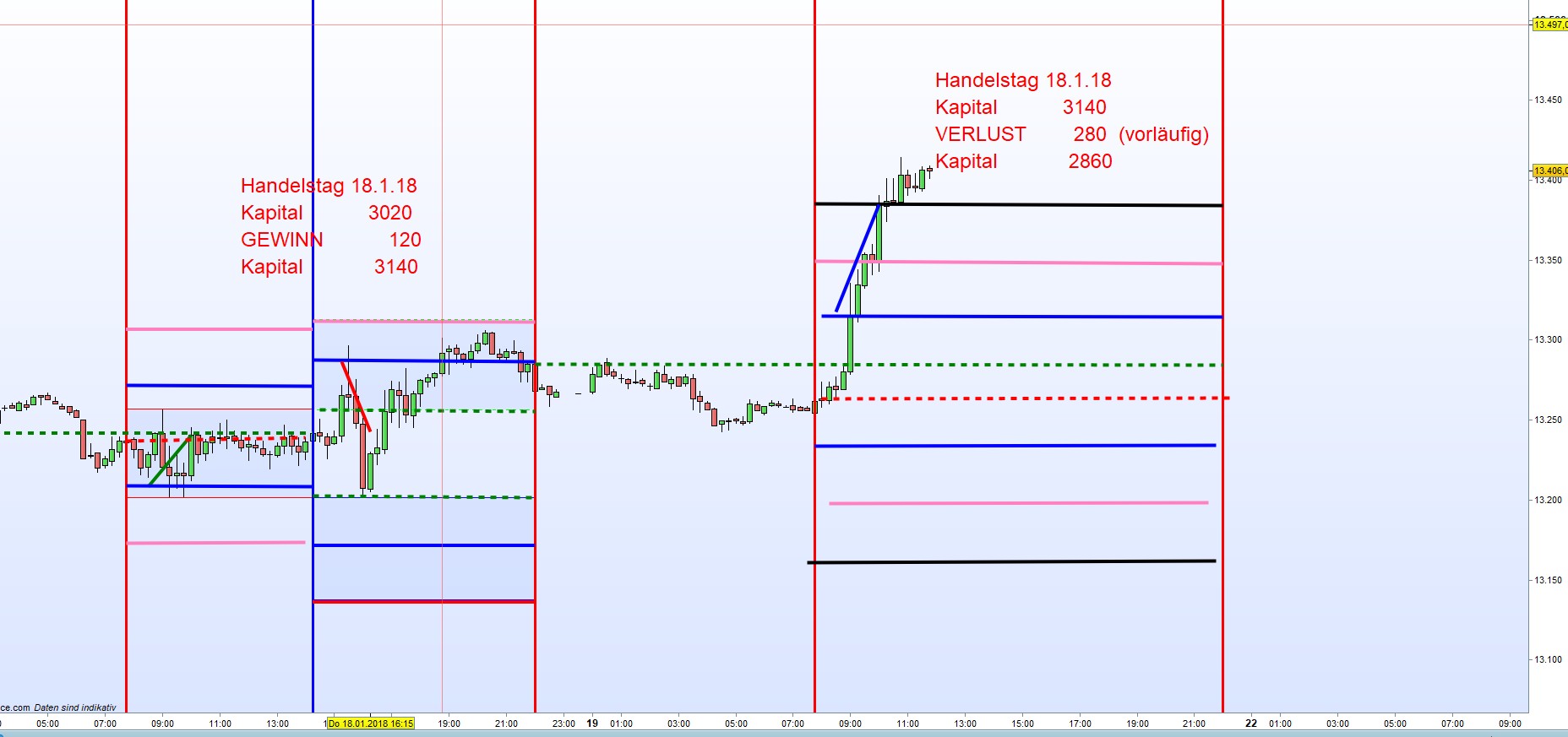 Wir unterscheiden zwischen einem mechanischen und zuzüglich diskretionären Handel der FDAX-TRADING-STRATEGIE. Der mechanische Teil hat nach Feststellung des täglichen Handelsgerüstes um 8h feste Bezugspunkte für Positionseröffnungen, Gewinnmitnahmen oder Stop Losses. Vorteil: Weniger Screen Time! Nachteil: Keine Berücksichtigung von DJIA Fut, sich anbahnende Trendtage, Veröffentlichungen von wichtigen Nachrichten....... Trotzdem hat dieser Handelsansatz gute Ergebnisse gebracht und wurden hier dokumentiert.