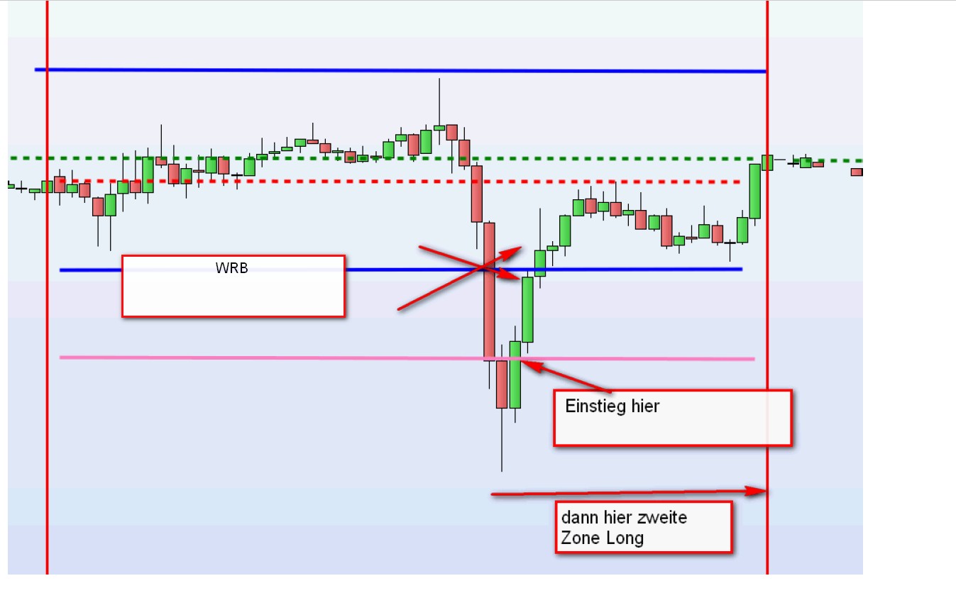 Der diskretionäre Handel berücksichtigt auch die Qualität der Positionseröffnungen an den Zonen also auch eine WRB oder lange Kerze die mit hohem Volumen Zonen sichtbar durchhandelt. Siehe Chart.