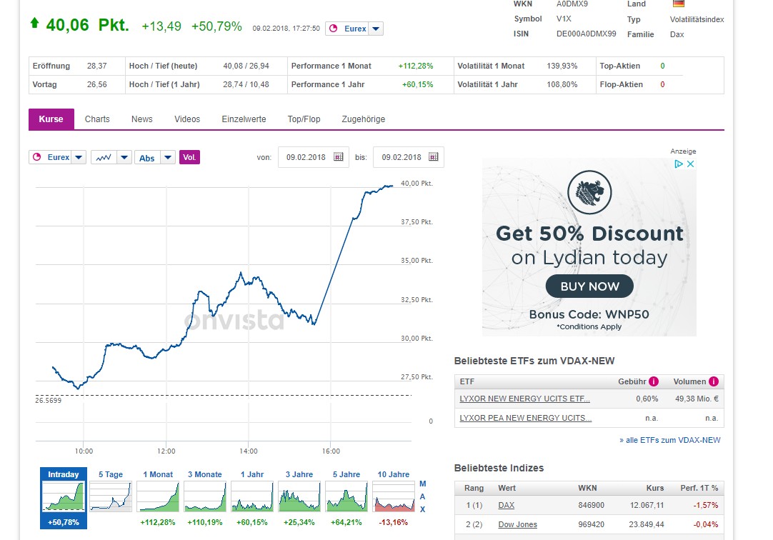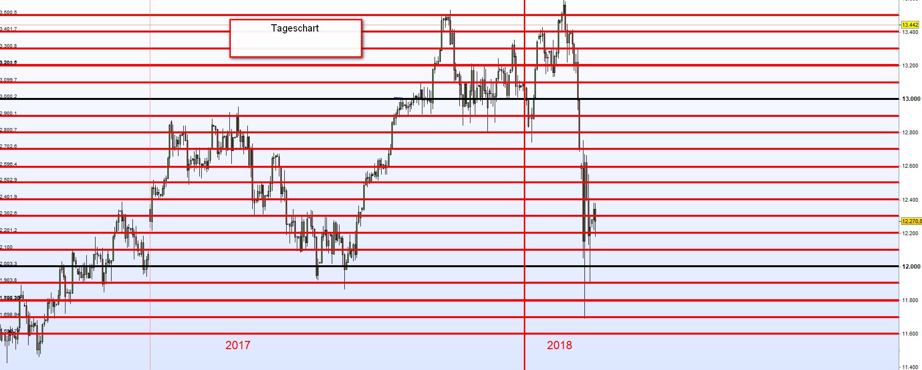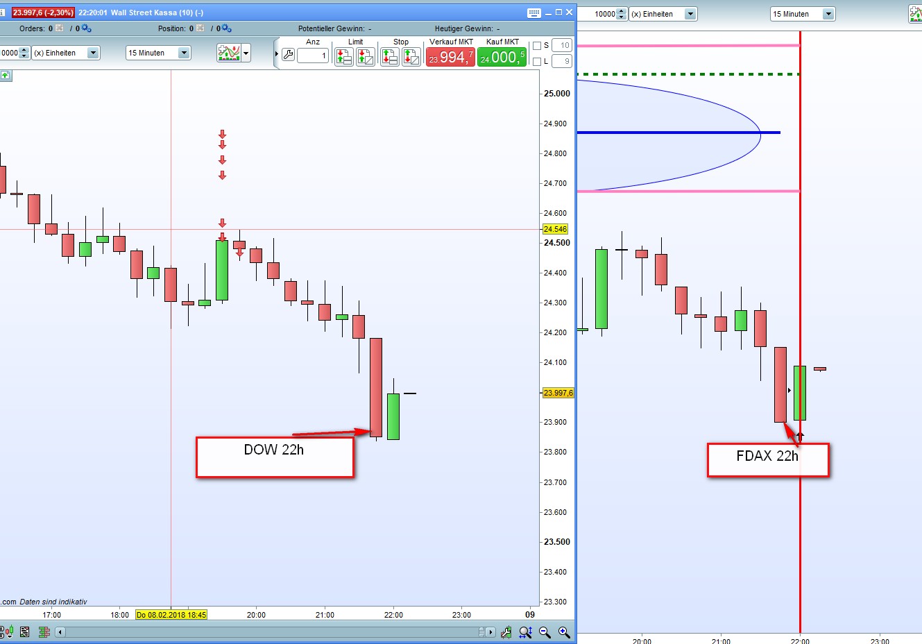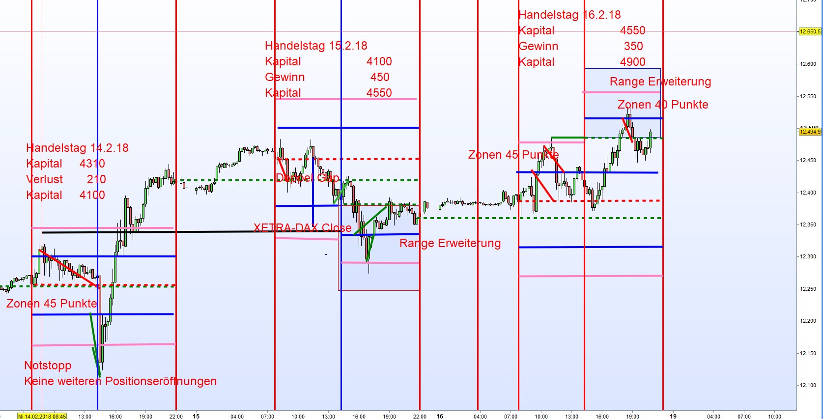 Heute war der spannendste Handelstag 2018. Der VDAX notiert nun über 40 und gegen mittag mussten die Zonen von 45 Punkte auf jeweils 60 Punkte angepasst werden. Das heutige Ergebnis ist somit + 720€. Insgesamt war Minimo und Maximo der Handelsrange 350 Punkte. Weitere Details im Chart.
