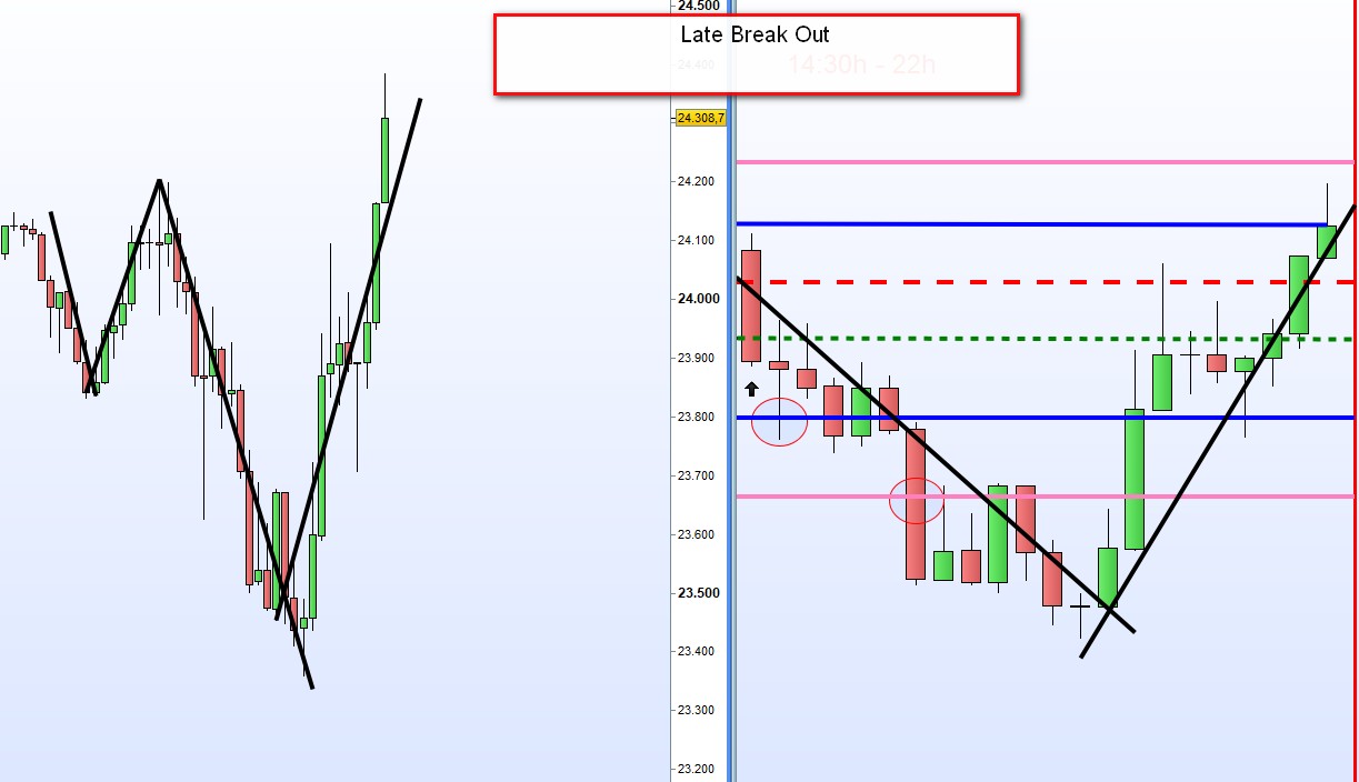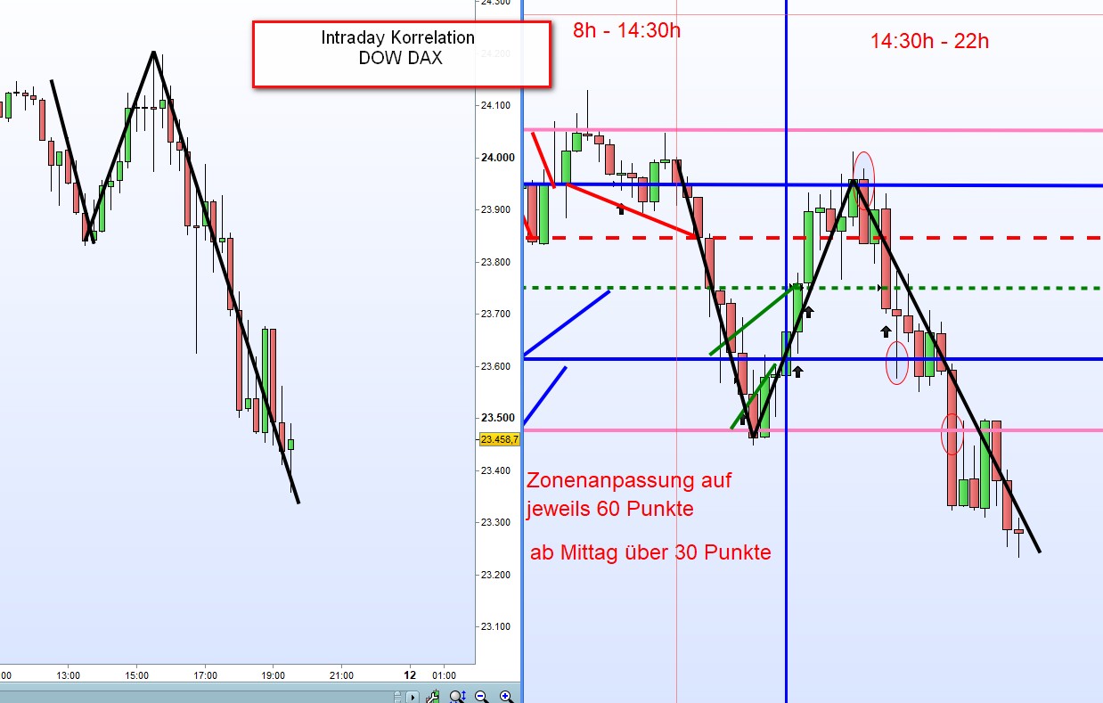 Enge Handelsspanne von 50 Punkten bis 14:30h haben bei Range Erweiterungen mit plötzlichen Meldungen aus den USA immer schlechte Karten. Ärgerlich wenn nach Ausstoppung in die richtige Richtung zum Mittelkurs gehandelt wird. Der diskretionäre Handel hat hier mit Wiedereinstieg nach Pivot mehr Erfolg.