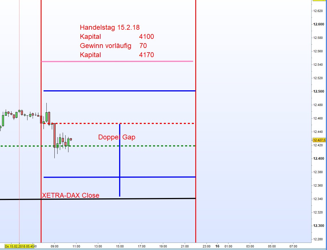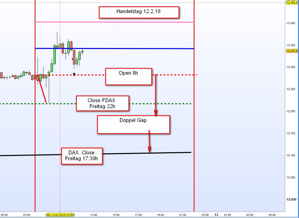 Eine Doppel Gap liegt vor, wenn der FDAX/DE30 um 22:00h +/- 20 Punkte über/unter dem Close XETRA-DAX um 17:30h schließt und nach Eröffnung am Folgetag um 8h mit einer Gap von +/- 50 Punkte in gleicher Richtung eröffnet. Insgesamt mindestens +/- 70 Punkte. Der Einstieg Long/Short erfolgt sofort nach Eröffnung und das Gewinnziel ist der Schlusskurs des FDAX um 22h. Der Einstiegskurs entspricht somit der ersten Zone und wenn die Position in in den Verlust tendiert, dann wird aus der ersten Zone die zweite Zone. Hier beginnen dann auch die Verlust Stopps.Wird das Kursziel erreicht, dann wird nach einem Retracement zum Eröffnungskurs keine neue Position eröffnet und der Handel wird mit den aktuellen Zonen und Range-Erweiterung fortgesetzt.