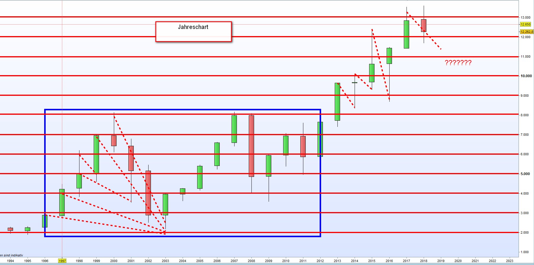 Bin immer wieder fasziniert: Jedes Bewegungshoch von 1000 Punkten wurde wiederum mit der Zeit um mindestens 1000 Punkte unterschritten. Salvo 2013 da waren es bisher nur 650 Punkte. Weiterhin auch seit Anfang 2017 jedes Bewegungshoch von 100 Punkten.