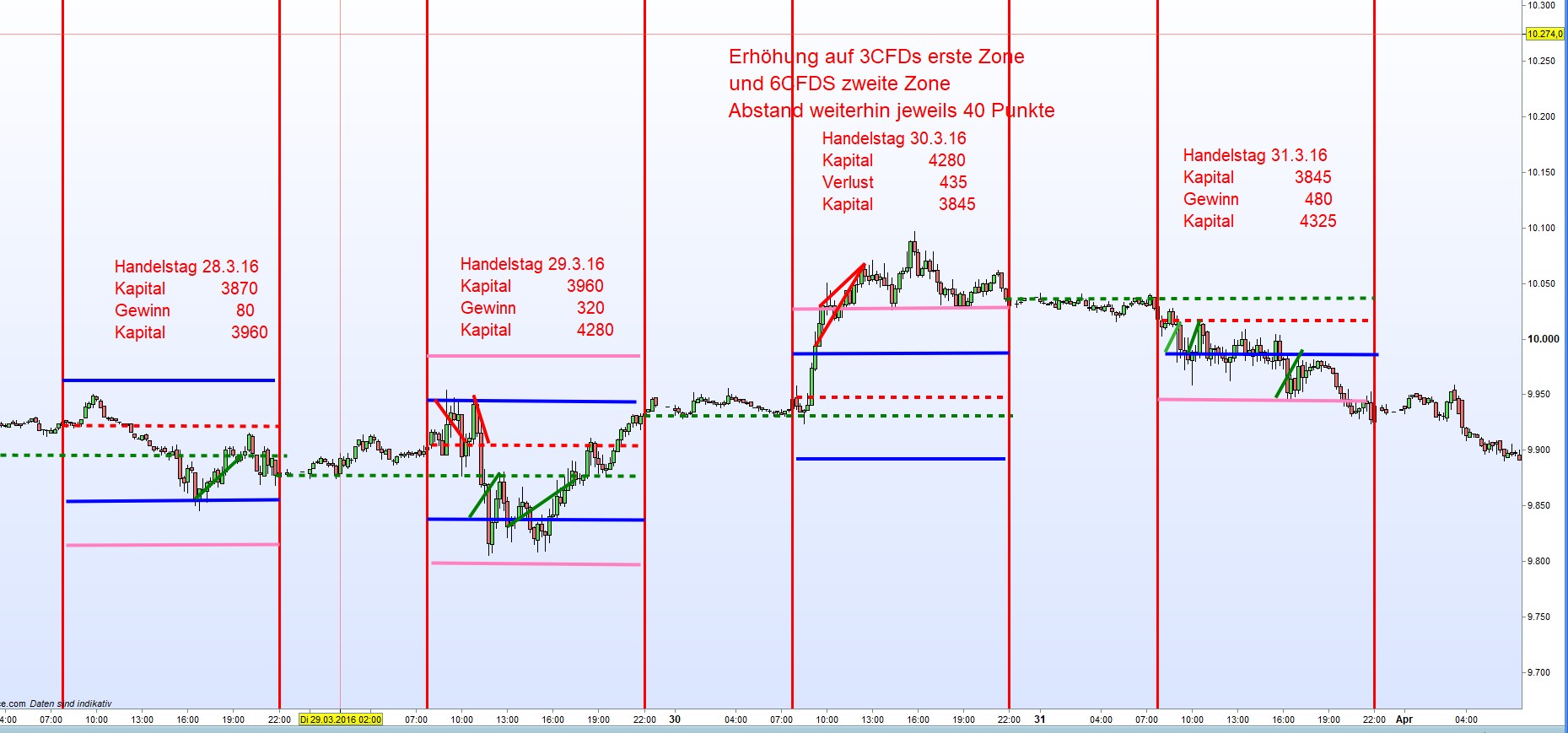 Das seit Anfang Februar 2016 ausgewertete Ergebnis gemäß dem systematischen Handelsansatz hat sich mit einem Anfangskapital von 2000€ am 29.3 verdoppelt. Es erfolgte demgemäß eine Positionserhöhung auf 3CFDS an der ersten Zone und 6 CFDs an der zweiten Zone. Sollte sich das Ergebnis auf 3000€ verschlechtern werden nach dem MM die Stückzahlen auf 2 und 4 CFDs zurückgesetzt et cetera. Zur Zeit sieht es allerdings gut aus. -