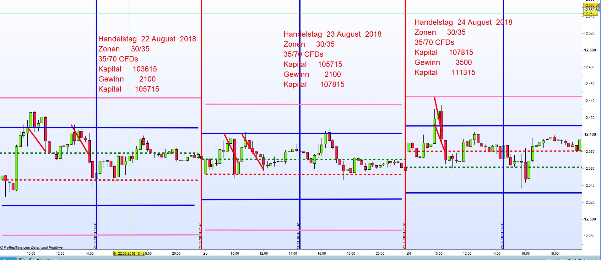 Verluste durch Ausstoppungen haben zu 80% gemeinsam, dass der Eröffnungskurs um 8:00h nicht oder nur geringfügig unter-überhandel wird. Wichtiger Augenmerk liegt auf den DJIA FUT über Nacht und die Eröffnung XETRA-DAX um 9:00h. Weiterhin wird die erste Zone und eventuell zweite Zone mit Elan überrollt. Es wird einem nicht immer gelingen, für die erste Zone keine Positionen zu eröffnen. Jedoch für die zweite Zone erst nach einer 15M Umkehrkerze oder Verzicht. Zur Entscheidung stand eine ganze Stunde zur Verfügung. Stellt man fest, dass der Kurs am Hoch oszilliert kann der diskretionäre Trader sich mit Mikro Trading versuchen (kein Bestandteil der Strategie) Das Resultat könnte wie folgt aussehen: