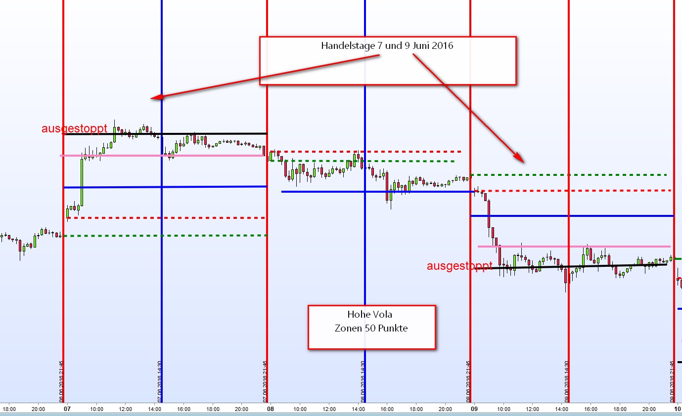 Wurden auf einer Seite des Charts Positionen aus beiden Zonen ausgestoppt und der Kurs steigt bis 14:30h nicht über/unter die zweite Aktionszone, dann wird auf einen Handel in der RE verzichtet.