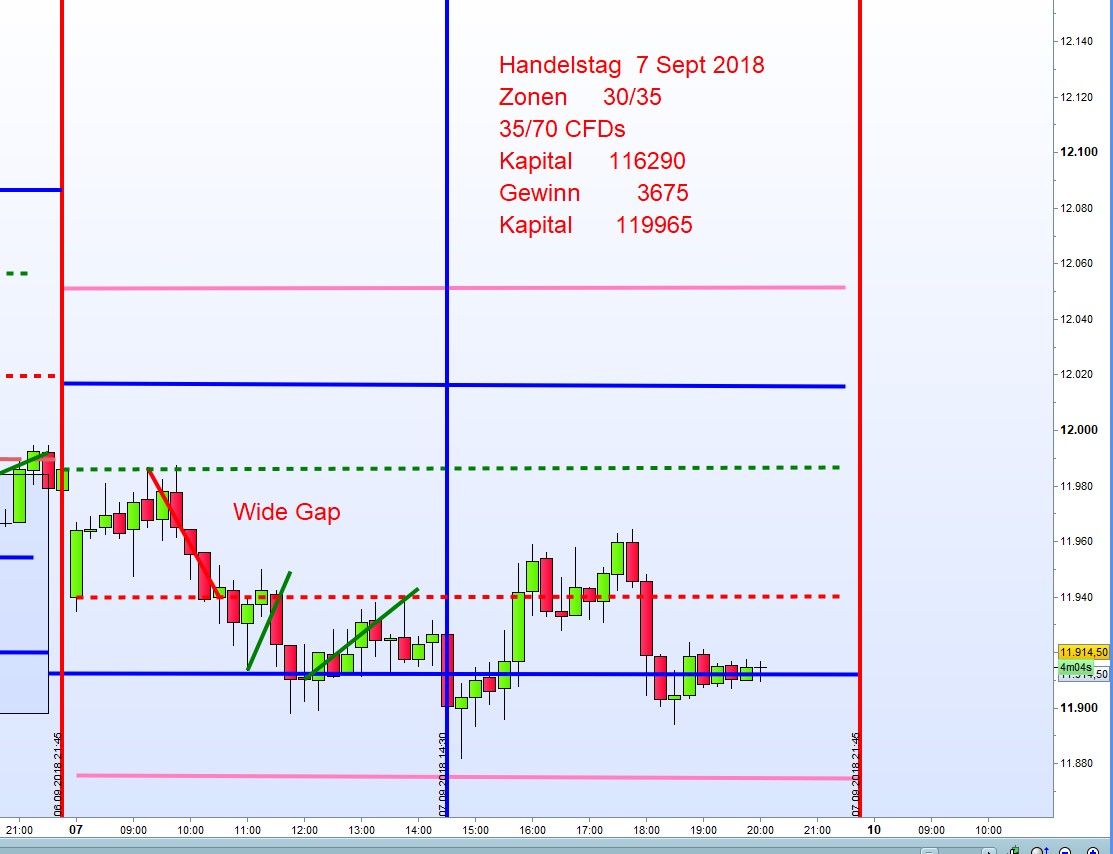 Der Handel mit volatilitätsabhängigen Zonen mit Einstieg, Gewinnziel und Verslustbegrenzung durch Stopps hat sich außerordentlich gut bewährt. Sofern sich die Gelegenheit nützlich anbietet und der Ersteinstieg unter/über den ersten Zonen stattfindet, werden die Zonen im gleichen Abstand verschoben. (Für die fortlaufende Statistik nicht, da davon ausgegangen wird, dass der diskretionäre Trader auf Sicht bessere Ergebnisse erzielt) Gemäß dieser Statistik war das Ergebnis heute +/- 0. Betrachten wir den Chart, dann wäre durch Verschiebung der Zonen nach Ersteinstieg ein hoher Gewinn erzielt worden. Wichtig in diesem Zusammenhang ist die erste 15M Kerze ab 9:00h. Eine sogenannte Wide Range Bar. Tritt diese auf, dann kann mit 80% Sicherheit mit einer Fortsetzung gerechnet werden. -