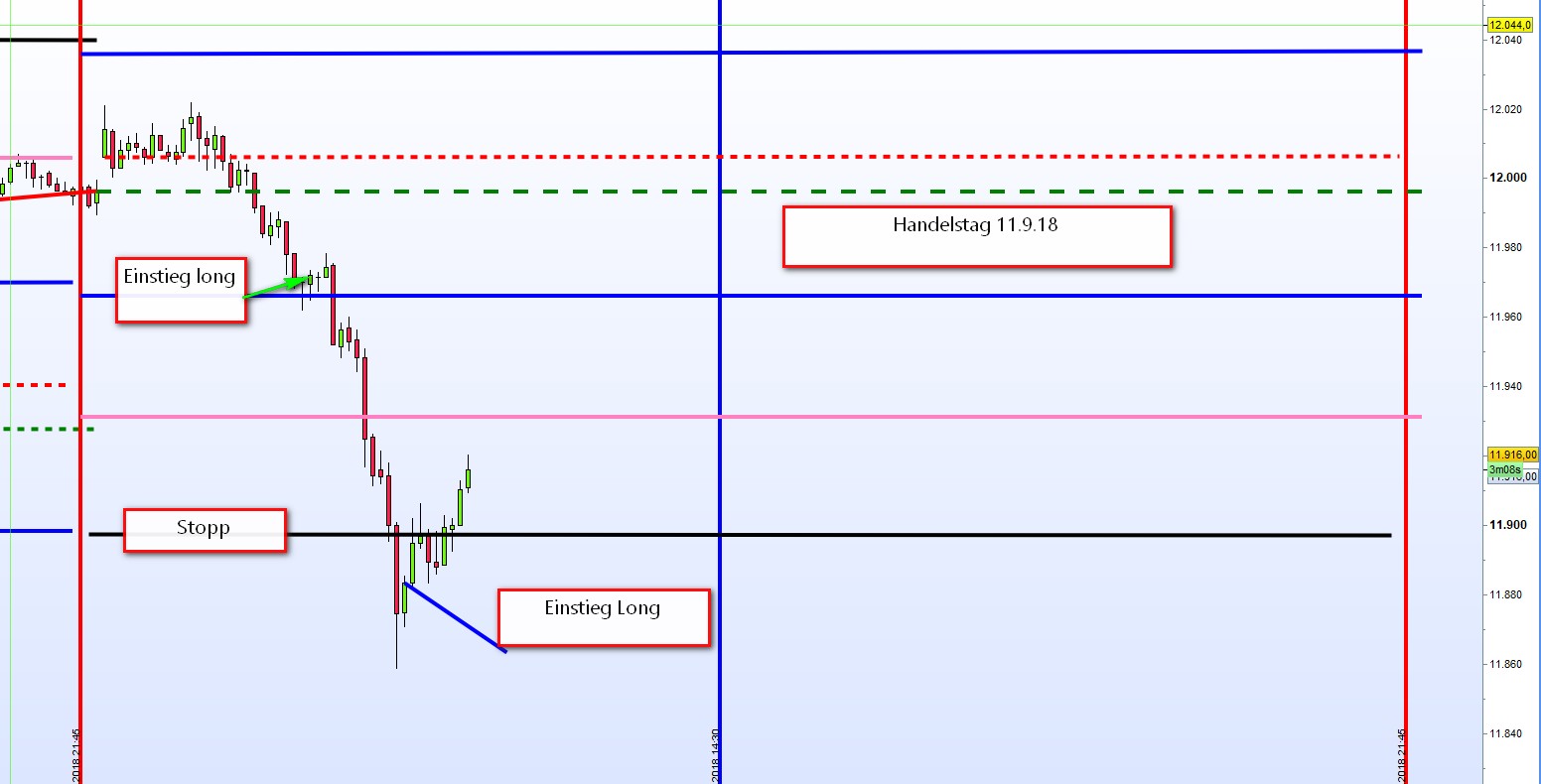 Auch heute wurden die Positionen aus den beiden Zonen Long um einige Punkte ausgestoppt. Der Gesamtverlust konnte allerdings durch Longpositionen in der Range Erweiterung verringert werden. In diesen Beiträgen geht es darum von diesen Verlusttagen zu lernen. Der zweite Einstieg Long wurde korrekt ausgeführt und drehte 5 Punkte vor der Ziellinie. Das ist dann noch kein Grund die Position zu schließen. Ergibt sich jedoch aus dem Chartbild, dass über 2 Stunden tiefere Tiefs zu erkennen sind, dann muss diese Position vor dem Einstieg in den Verlust geschlossen werden. Die Position aus der ersten Zone Long wäre zwar danach ausgestoppt worden, das Tagesergebnis somit aber neutral. -