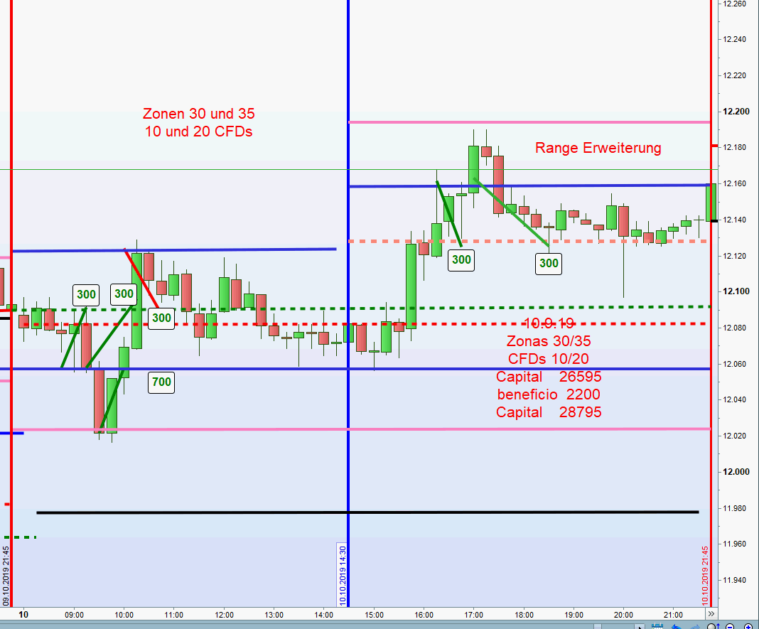 möchte ich hier erwähnen, dass ohne das Forum Candletalk das aktuelle Regelwerk nie vollendet worden wäre. Zurzeit wird die Strategie in einem kleinen Kreis von deutschen und spanischen Interessierten über Telegram gehandelt. Es handelt sich allerdings um Part Time Trader die das volle Potenzial noch nicht ausschöpfen können. Das gesamte Regelwerk liegt in beiden Sprachen vor und gemäß diesem wird morgens um 8h der Handelsrahmen eröffnet. Je nach disponibler Zeit begleite ich den Tag mit nützlichen Kommentaren und nach 22h wird das Ergebnis dargestellt. Am Wochenende erfolgt eine Zusammenfassung. Alles geschieht in bester Harmonie.