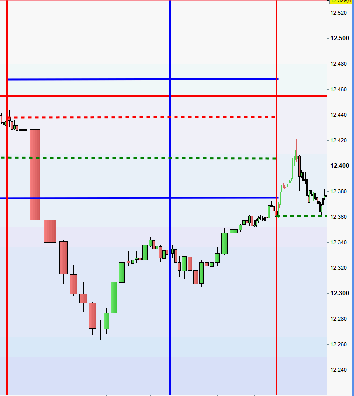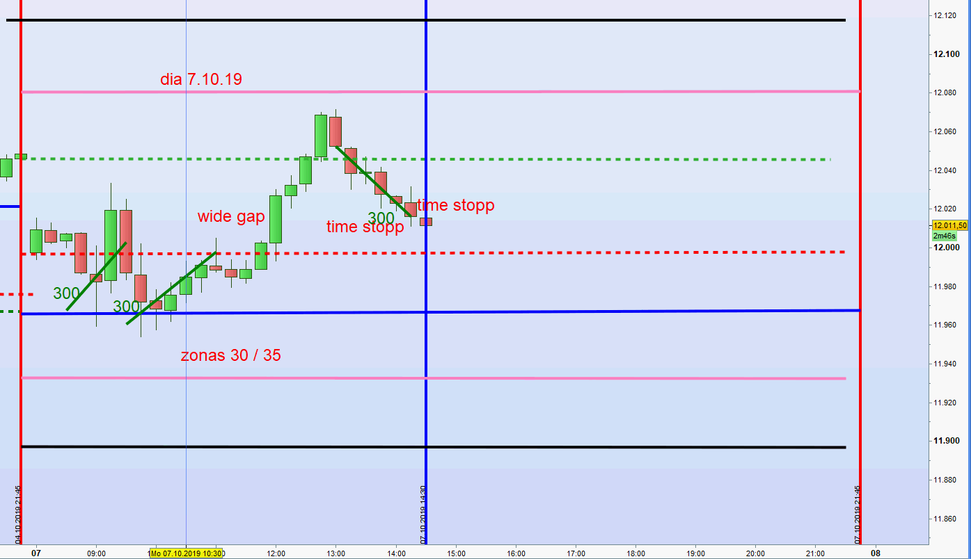 Chart heute. Zwei Mal wurden erfolgreich Longpositionen von der ersten Zone gehandelt. Bei einem wide gap erfolgt gemäß dem Regelwerk ein Einstieg short an dem Schlusskurs vom Freitag mit dem Gewinnziel hin zu dem Eröffnungskurs. Um diese Uhrzeit bestimmen jedoch die DOW FUT das Geschehen und daher habe ich erwähnt: Vorsicht mit Shortpositionen um diese Uhrzeit. Bedeutet: Einstiege Short, wenn noch überhaupt, nur mit einer 15M Umkehrkerze.