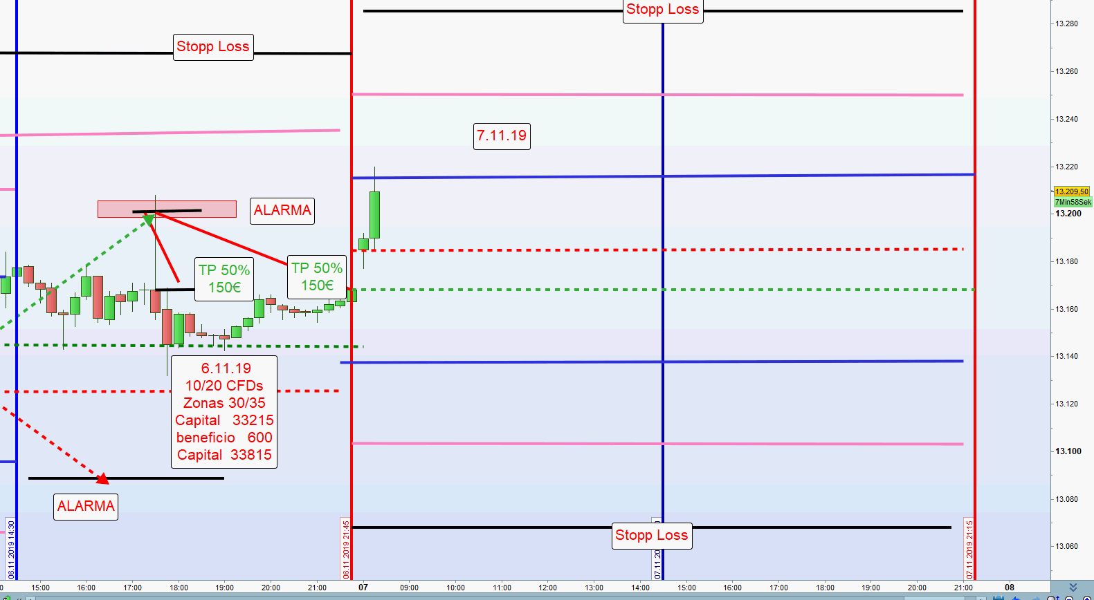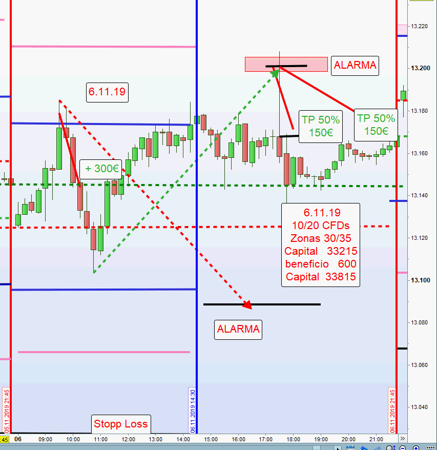 Die Handelswoche war geprägt von einer niedrigen Volatilität unter 15 so dass die erste Aktionszone Long nie angehandelt wurde. Am 4.11.2019 wurde durch den Trendtag ein Verlust von 1100€ eingefahren.