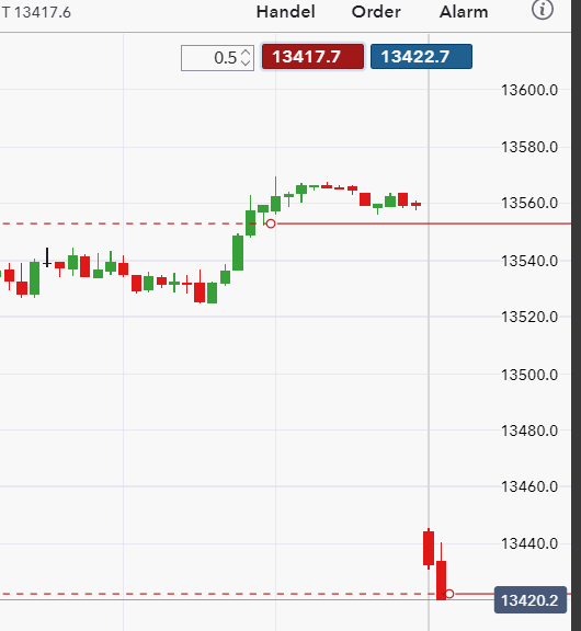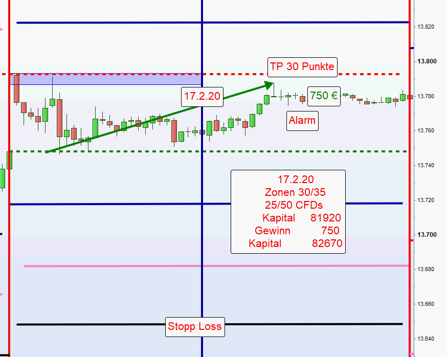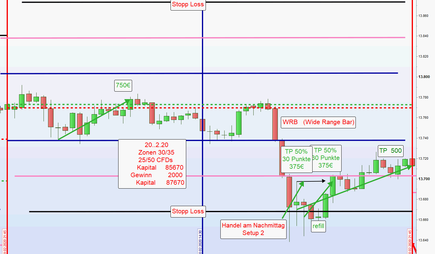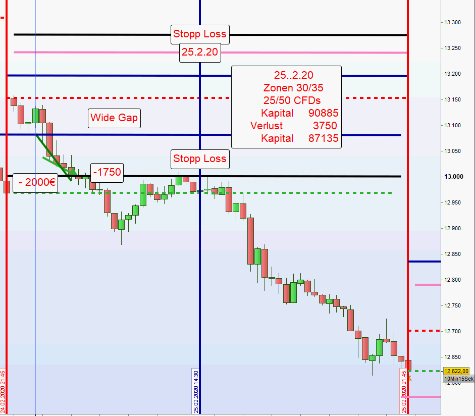 Es ist ein Verlust von 3750€ zu verzeichnen. Der von mir vorgeschlagene Handel innerhalb der sehr weiten Gap hat sich als kontraproduktiv herausgestellt. Die regulären Positionseröffnungen an dem Schlusskurs vom Vortag und in Folge an der zweiten Zone wären vormittags sehr erfolgreich gewesen. Dies als Bemerkung für die nachbörsliche Analyse. -