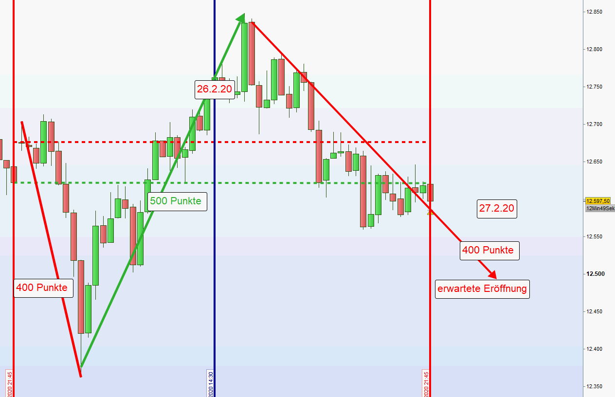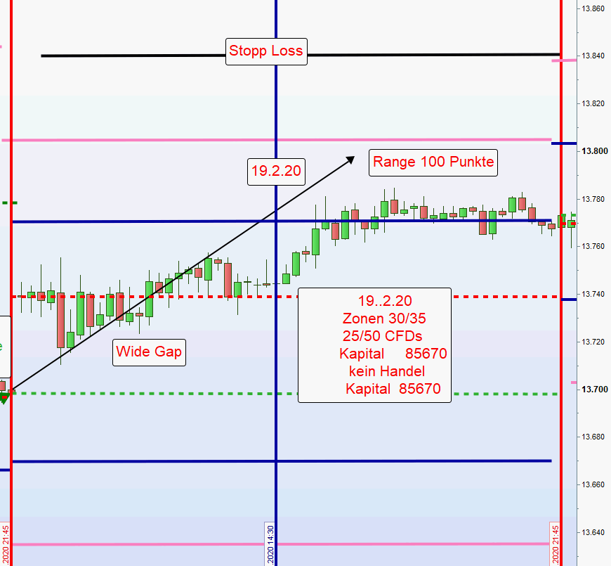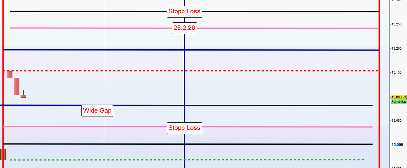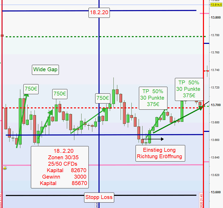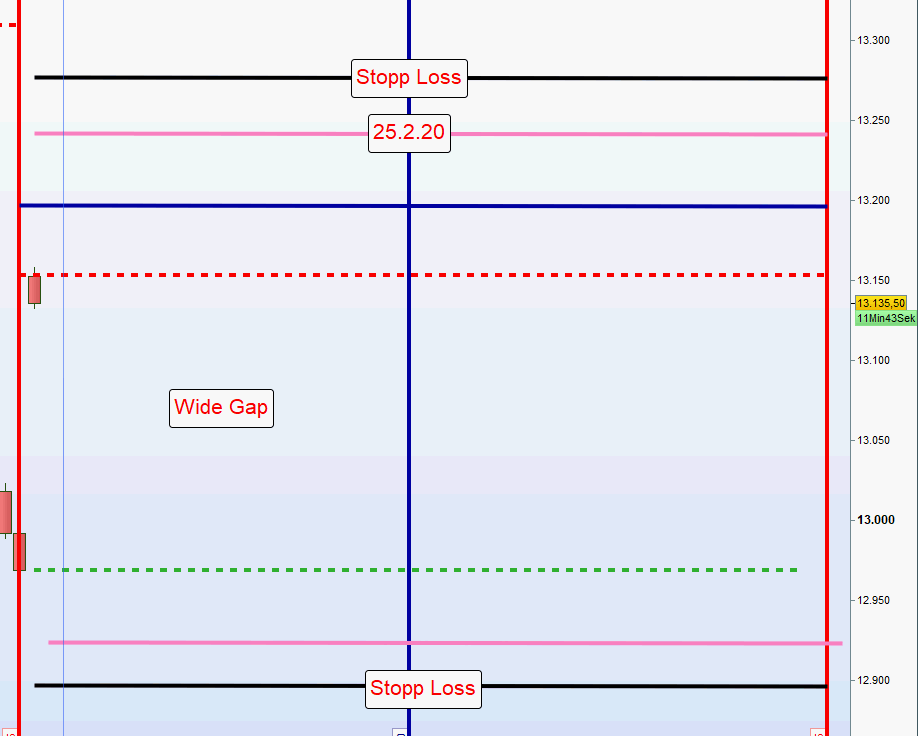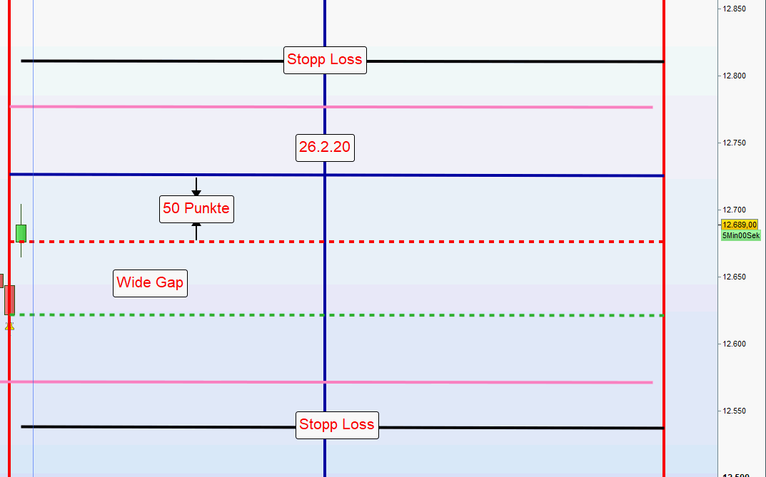 Nach der korrekten Markteinschätzung wäre dies eine Fehlentscheidung. Daher Wide Gap und Shortzonen über dem Eröffnungskurs. Eine Notierungslücke von 182 Punkten ist allerhand Holz und es könnte zu keinem Handel kommen. Als Alternative setzen wir die erste Zone Long auf 70 Punkte unter dem Eröffnungskurs und warten die Eröffnung um 9:00h ab. Einstiege Long nur mit 5M Umkehrkerze. -