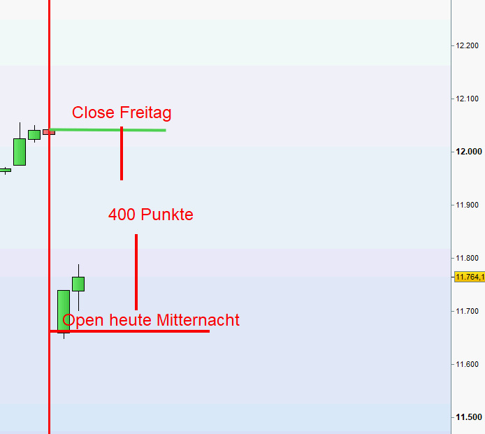 Treten diese auf, dann wird an diesem Tag erst am Nachmittag gehandelt. Grund: nach einem Monster-Gap können nach Eröffnung um 8:00h die ersten Kerzen sehr weit sein und somit eröffnete Positionen schnell ausgestoppt werden.