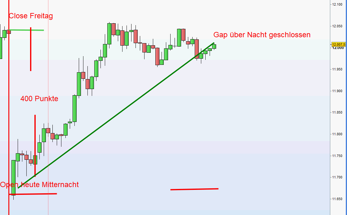 Heute Morgen eröffnete der Kurs mit einer Notierungslücke von Plus 182 Punkten. Dementsprechend notieren die US Futures im satten Plus und nach gängiger Regel sollte ein Trendtag Long gehandelt werden.