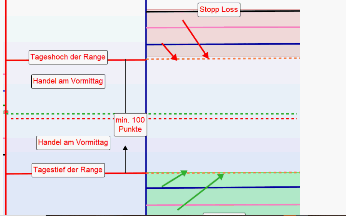 2.Handel zum Mittelkurs, wenn Kurs die morgens definierte Stopp Loss Linie durchhandelt. Short und Long