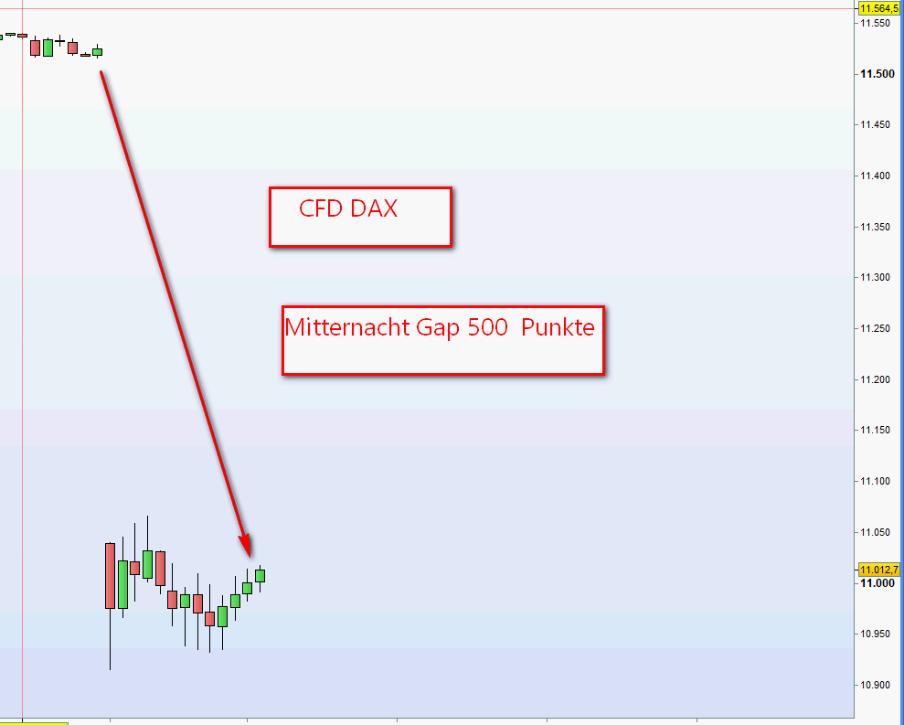 Notieren um 8:00h die DOW FUT (DJIA FUT) mit 0,5% im plus/minus und die asiatischen Börsen, China und Japan, haben ebenfalls mit 0,5 plus/minus geschlossen erwägen wir den Einstieg Long/Short wenn ein Katalysator in Gestalt sehr positiver/negativer Nachrichten über Nacht vorliegt.
