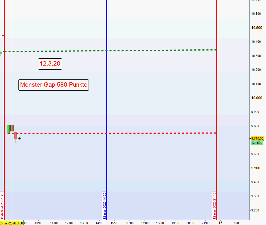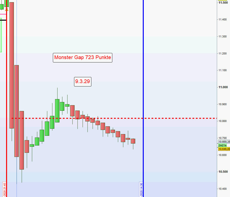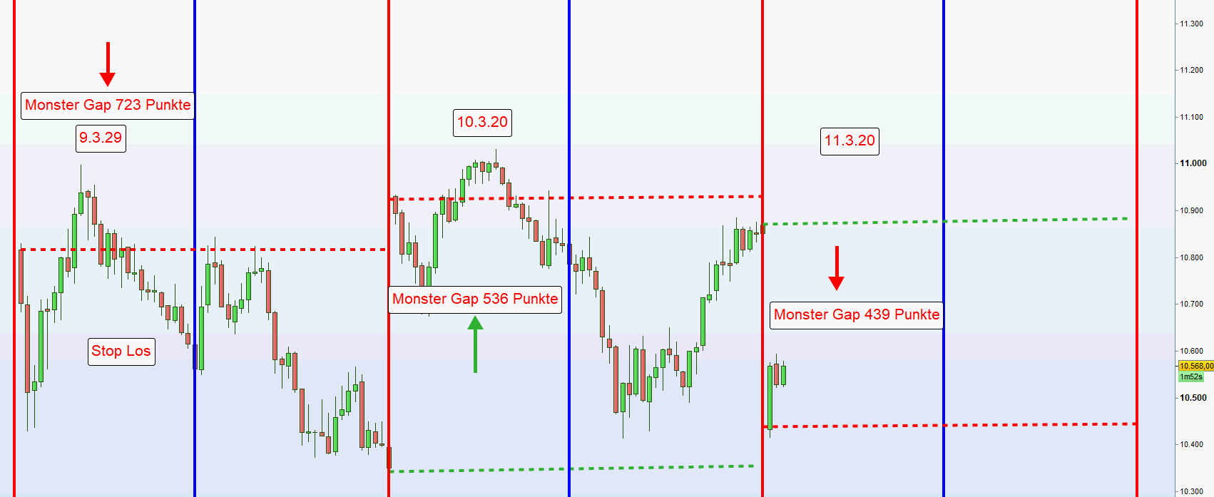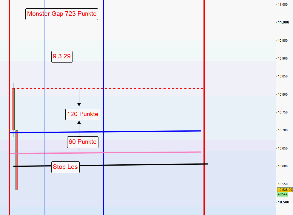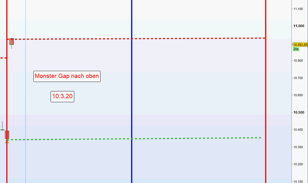 Treten diese auf, dann wird an diesem Tag erst die Range Erweiterung gehandelt. Grund: nach einem Monster-Gap können nach Eröffnung um 8:00h die ersten Kerzen sehr weit sein und somit eröffnete Positionen schnell ausgestoppt werden.