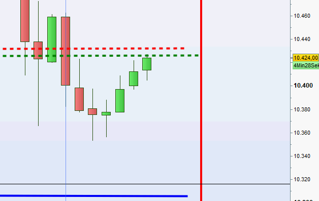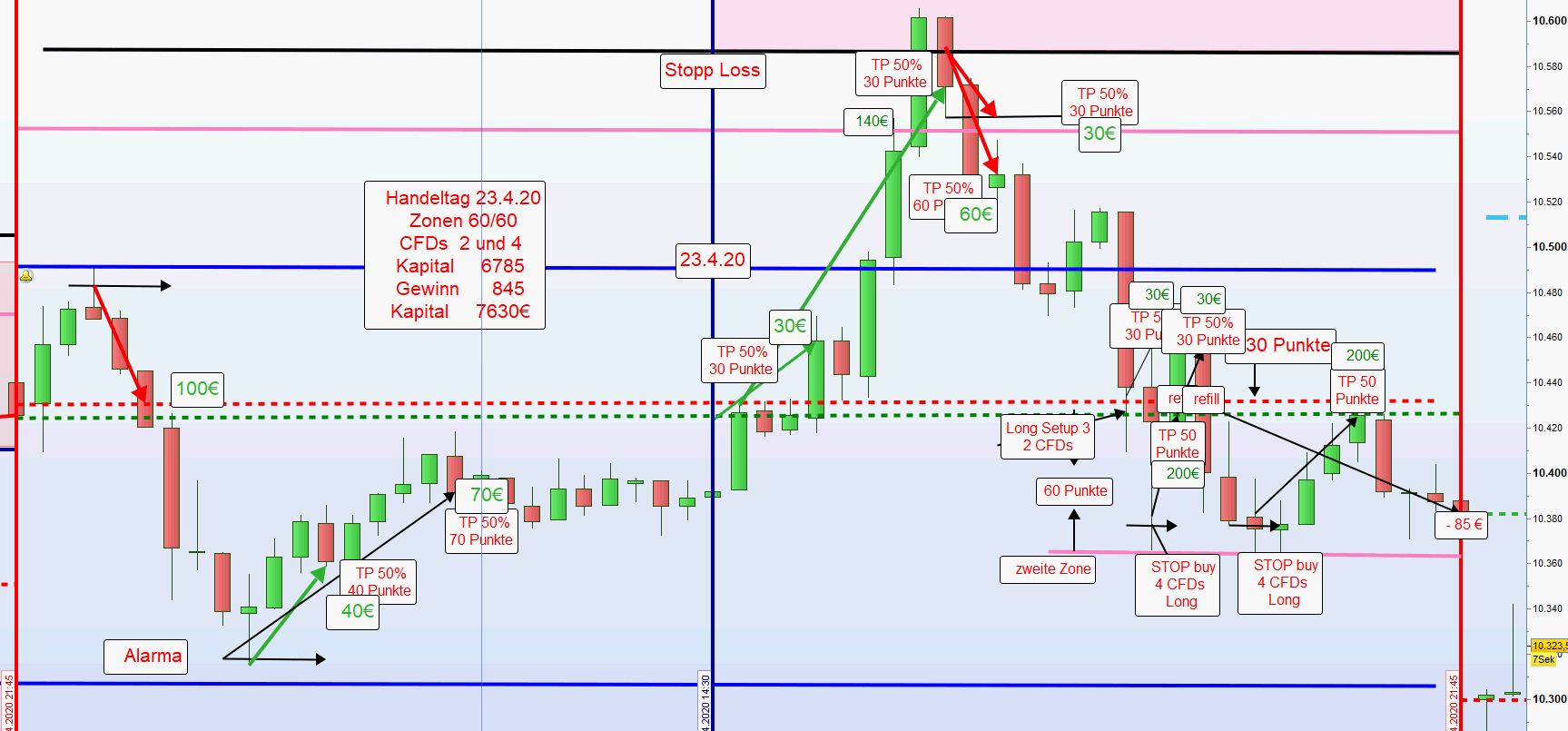 Es gehört zu den guten Ritualen nach Erstellung des Handelsrahmens 10 Punkte vor den Zonen einen Alarm zu setzten und bereits vorher die Order mit Gewinnziel und Stopp Loss aufzugeben.