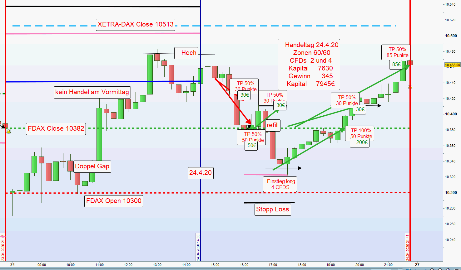 Nach dieser Vorgehensweise wurde gestern das bisher beste Ergebnis erzielt wobei der Einstieg Long vormittags borderline war. Wie des öfteren mitgeteilt, geht es bei all meinen Darstellungen nicht darum ein besonders gutes Ergebnis zu dokumentieren sondern den Betrachter die Möglichkeiten gemäß dem Regelwerk zu erläutern