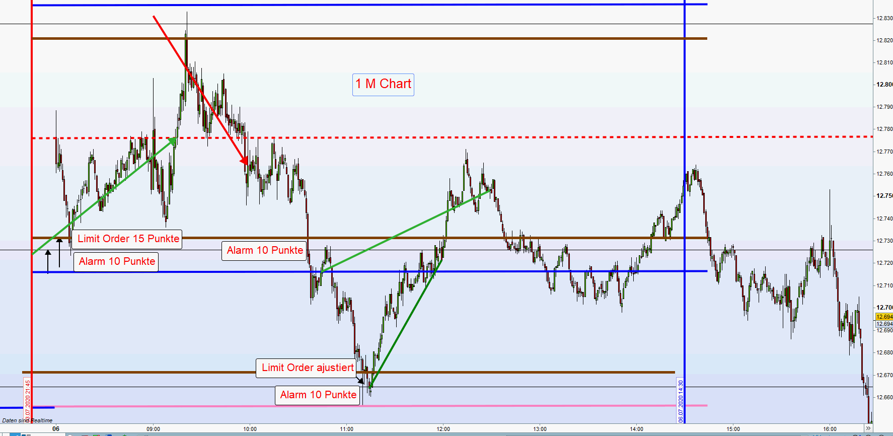 Ich habe mir wiederholt viel Mühe gegeben um den Einstieg in eine Position zu erklären. Ohne den beherzigten Einstieg wird der Erfolg reduziert. Auch heute erfolgten die Eröffnung von Positionen nach dem Alarm und Einstieg durch den bereits in Wartestellung gehaltene Limit Order. Sehr deutlich sichtbar mit dem 1M Chart. Das muss geübt werden.