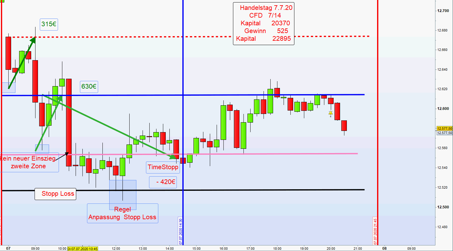 im Laufe des morgens dann unweigerlich im Stopp Loss. So auch heute. Meistens erholt sich der Kurs dann wieder und, sofern nur noch die Position aus der ersten Zone offen ist, wenden wir die Regel " Anpassung stopp Loss" an.