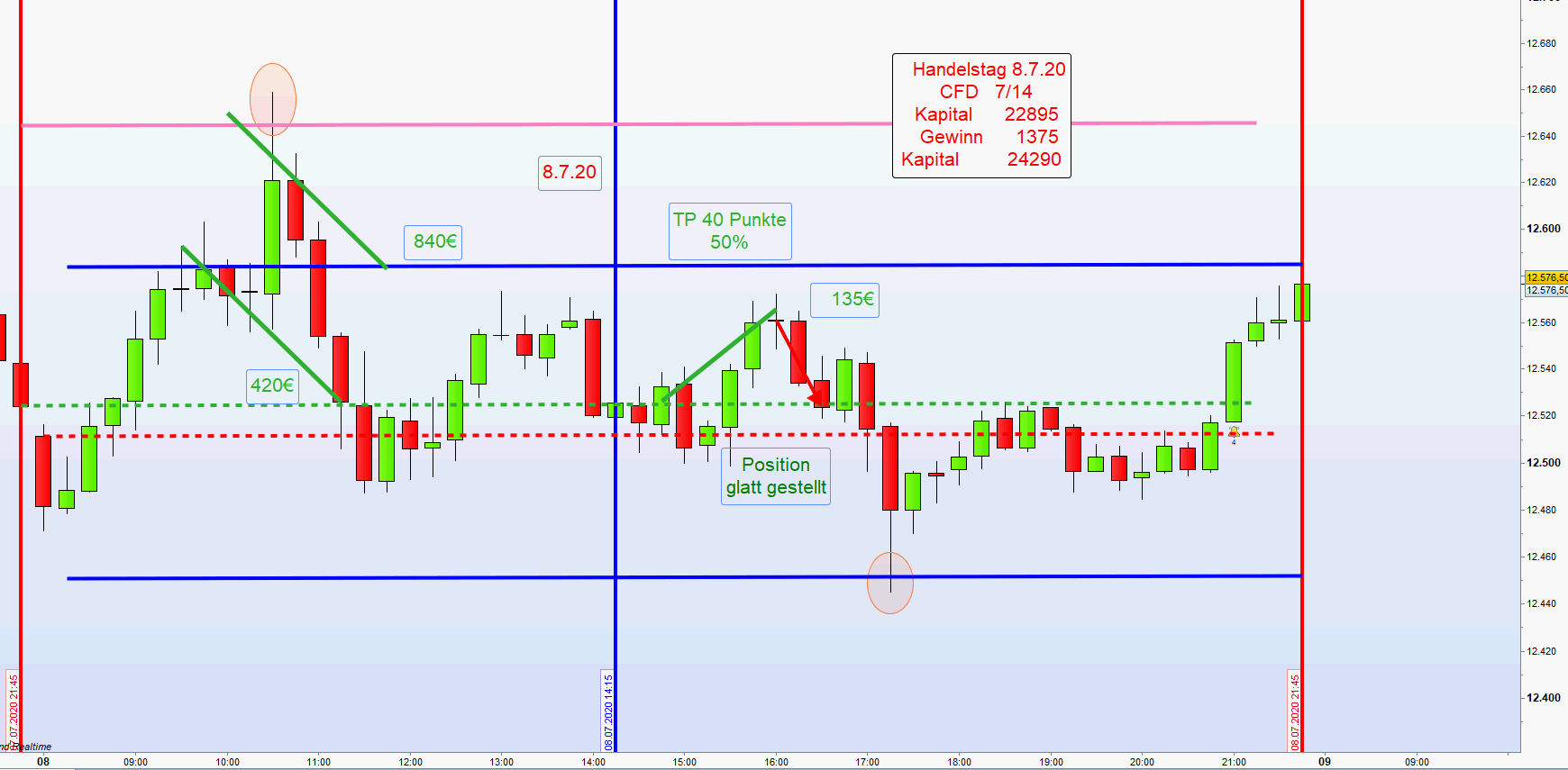 Es war heute früh zu spüren, dass der Markt die Kurslücke schließen wollte. Daher wurde auch eine seltene Gewinnmitnahme von 50% von der zweiten Zone aus vorgeschlagen. Nachdem doch noch ein hübscher Gewinn erzielt werden konnte galt es diesen zu sichern. In Konsequenz wurde die noch offene Position aus der ersten Zone mit einem GS Stopp geschlossen.