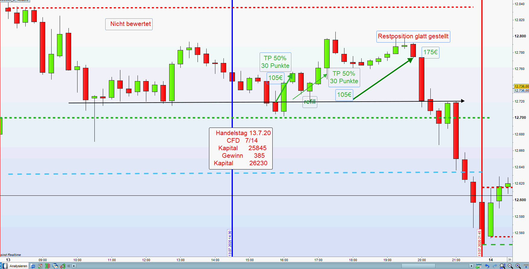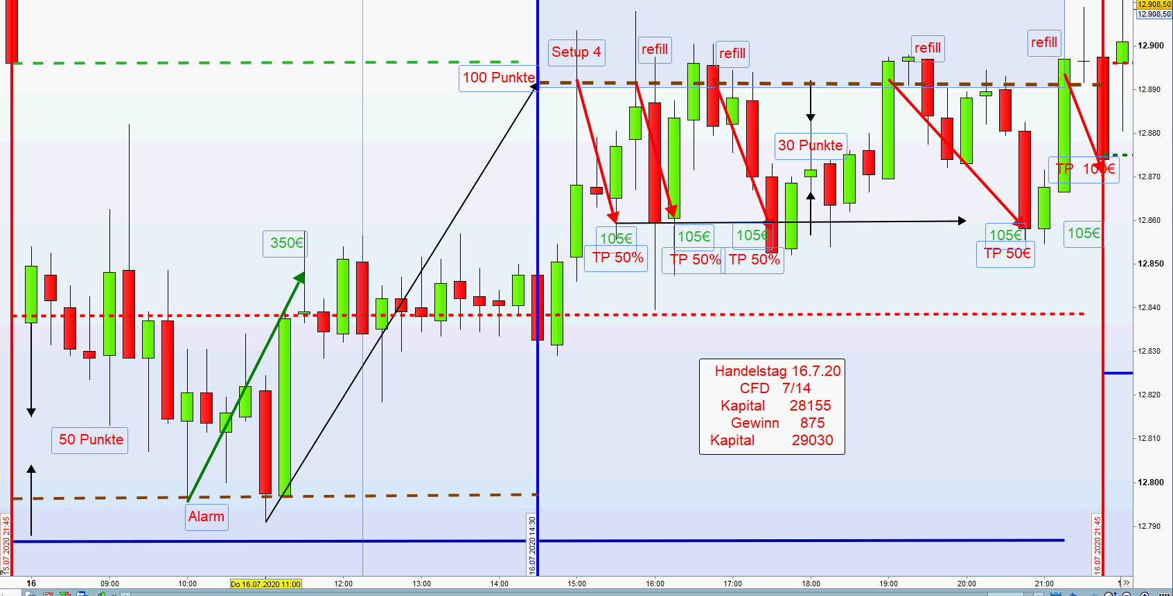 Zuweilen ergibt sich nachmittags die Möglichkeit mehrere Setups in Folge zu handeln Wurde nachmittags ein Setup erfolgreich abgewickelt, dann sollte der nächste Einstieg nur auf der anderen Chartseite sein. Dies vermeidet Over Trading. -