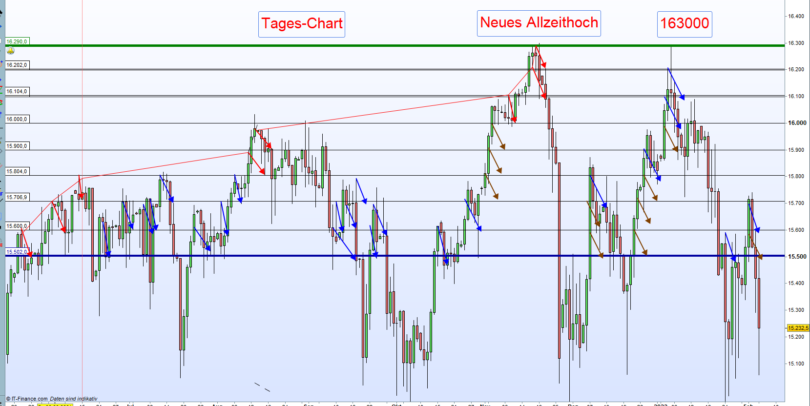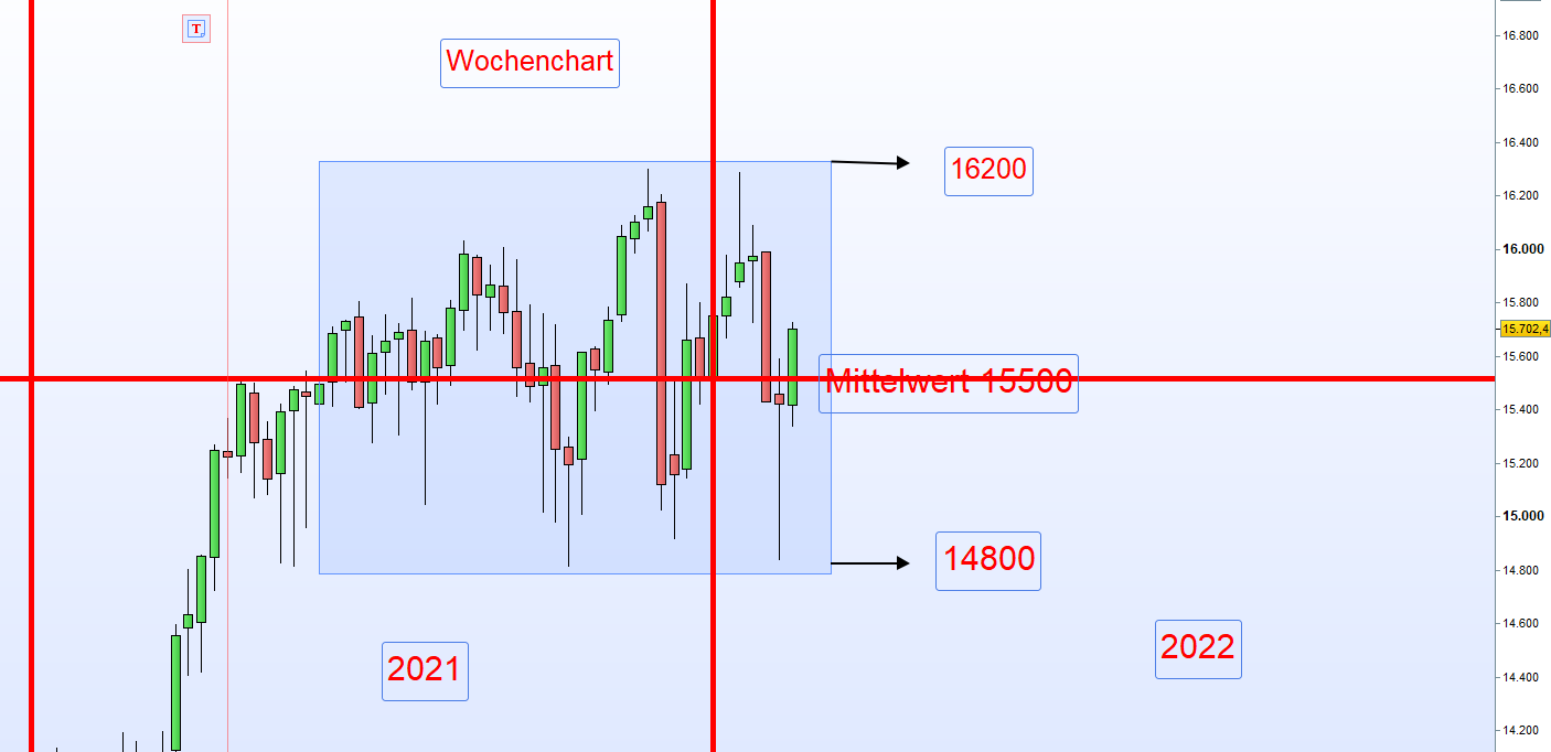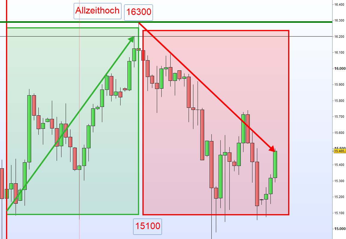 Sieben Monate Tageschart. Für diese nehmen wir den Mittelkurs 15500 bis zum Allzeithoch 16300.