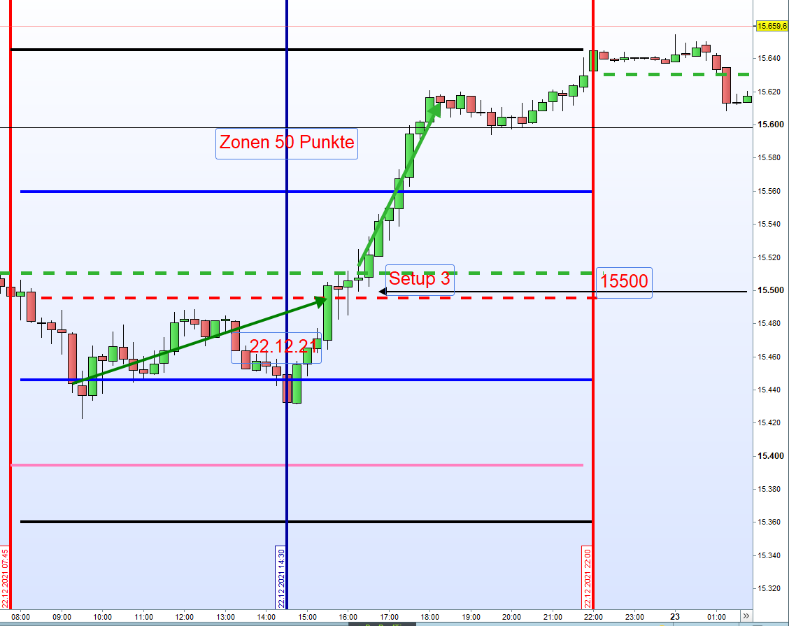 Zweiundzwanzig blaue Pfeile beginnen aufsteigend wenn der Mittelkurs von 15500 wieder erreicht wurde. alle Pfeile haben das Gewinn-Ziel von 100 Punkten am Folgetag erreicht.