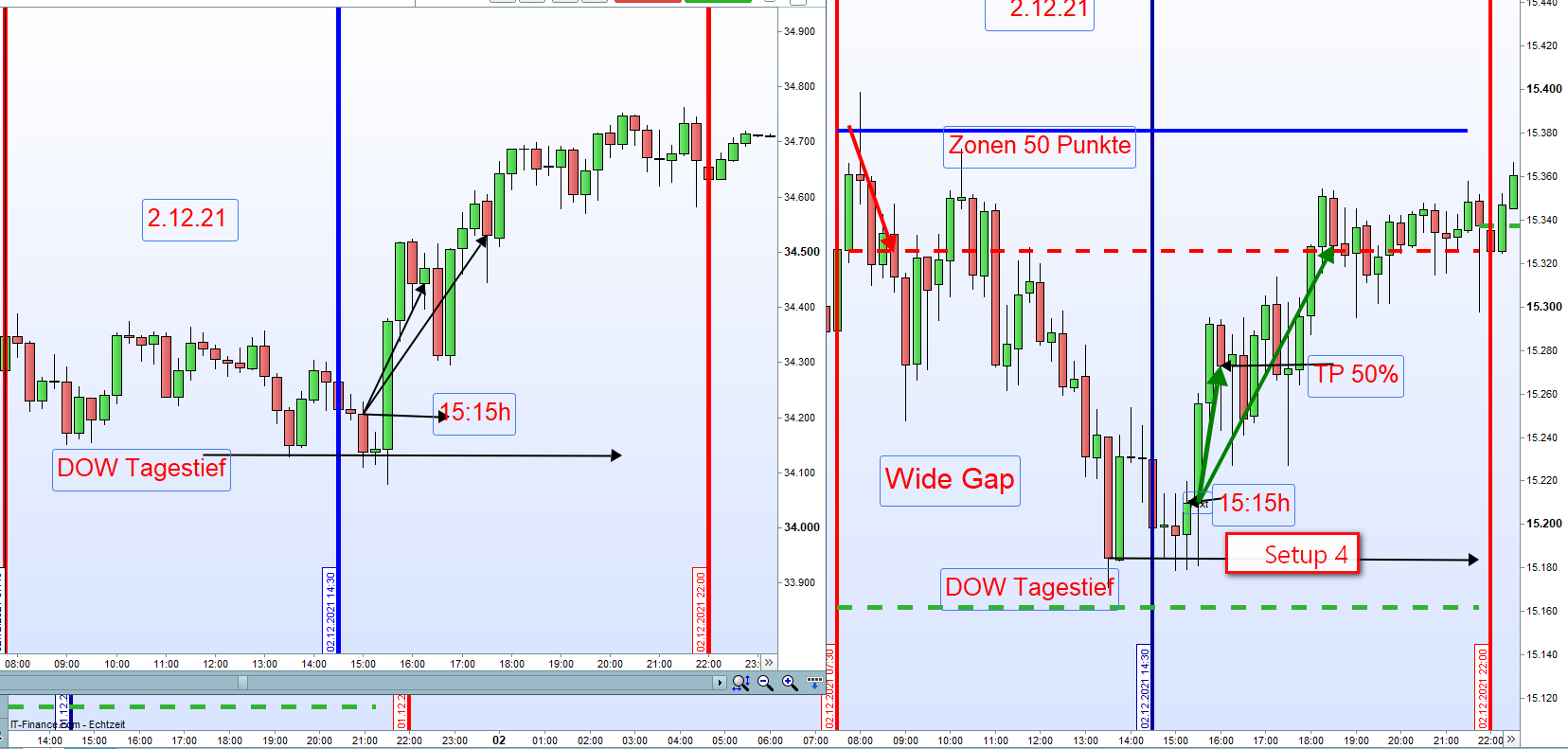 Unter gewissen charttechnischen Voraussetzungen, Kurs für Short sollte nicht im Plus notieren und für Long nicht im Minus. kann in Richtung der Zonen gehandelt werden. Der Einstieg wird von der vollen Kerze beginnend um 7:45h bestimmt. Diese sollte mindestens die Hälfte der tagesgültigen Zonenbreite ausmachen. Dazu gehört dann noch eine Stopp Sell/Stopp Buy Order von 20 Punkten unter/über dem Ersteinstieg. Wird diese ausgelöst entsteht zunächst ein Verlust von 20 Punkten + Spread. Glatt gestellt wird die Position im Gewinn im Laufe des Tages üblicherweise an den zweiten Zonen vormittags oder an den zweiten Zonen der Setups am Nachmittag. Dann wird dort eine neue Position nicht mehr verdoppelt.