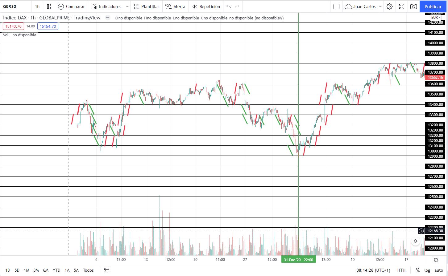 Gráfico diario de siete meses. Para este tomamos el punto medio 15500 hasta el máximo histórico 16300.