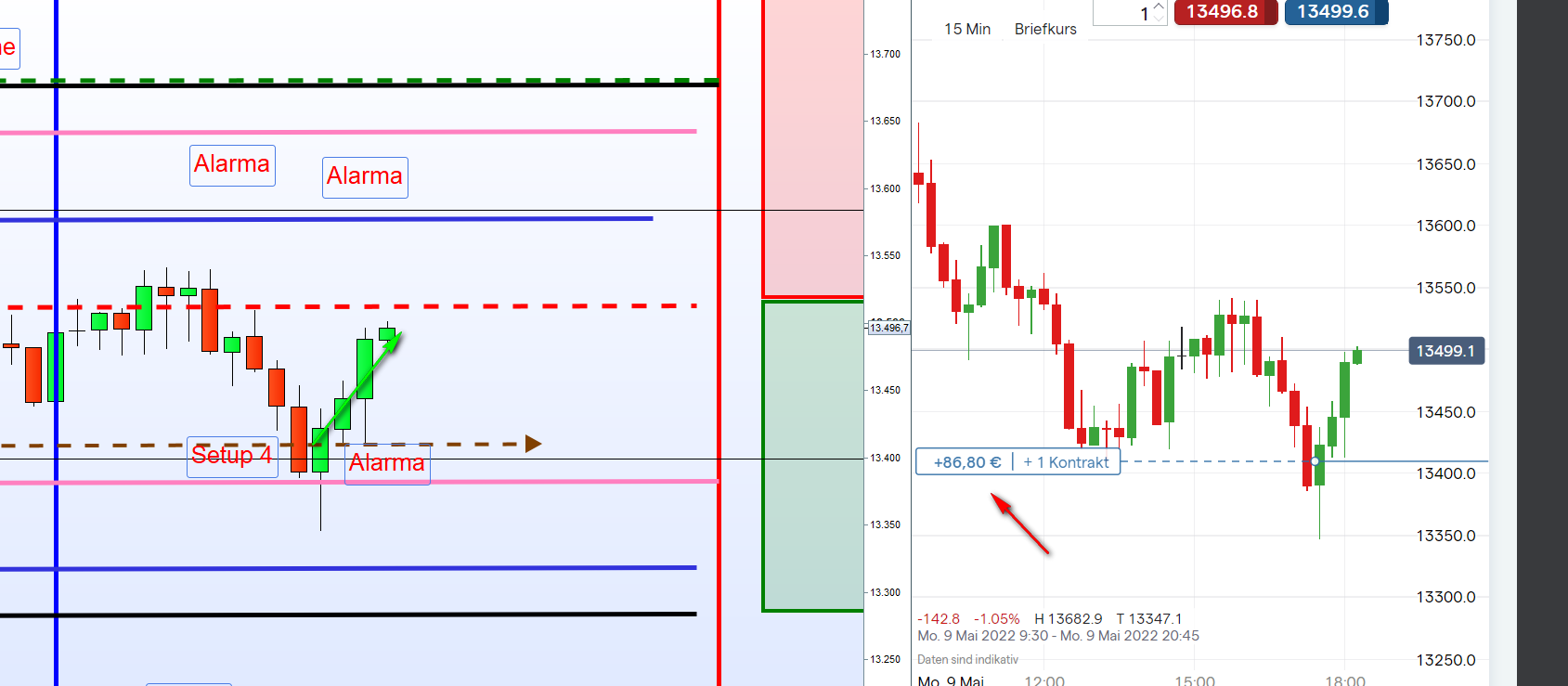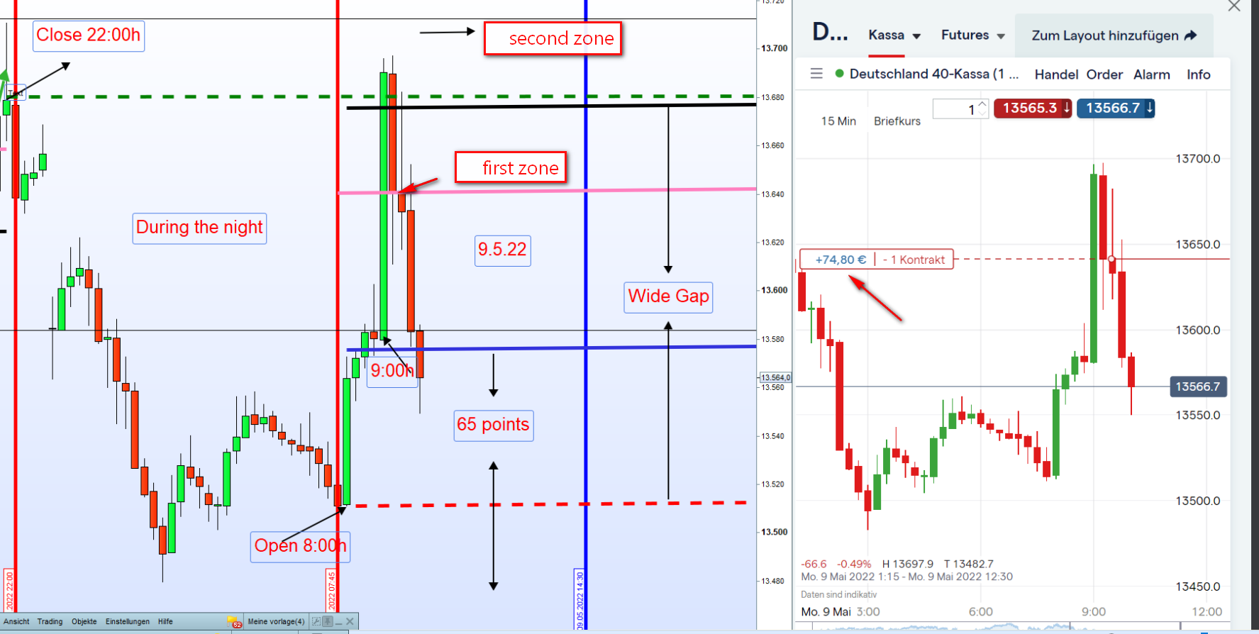 Gestern: Wenn der Einstieg Short an der eigentlichen zweiten Zone war, und der Preis fällt über die eigentliche erste Zone hinaus, dann eröffnen wir dort keine neue Position. Auch wenn der Kurs gestern dahin wieder zurück kehrte. Die erste Zone bleibt dann auch die erste Zone. Verständlich?
