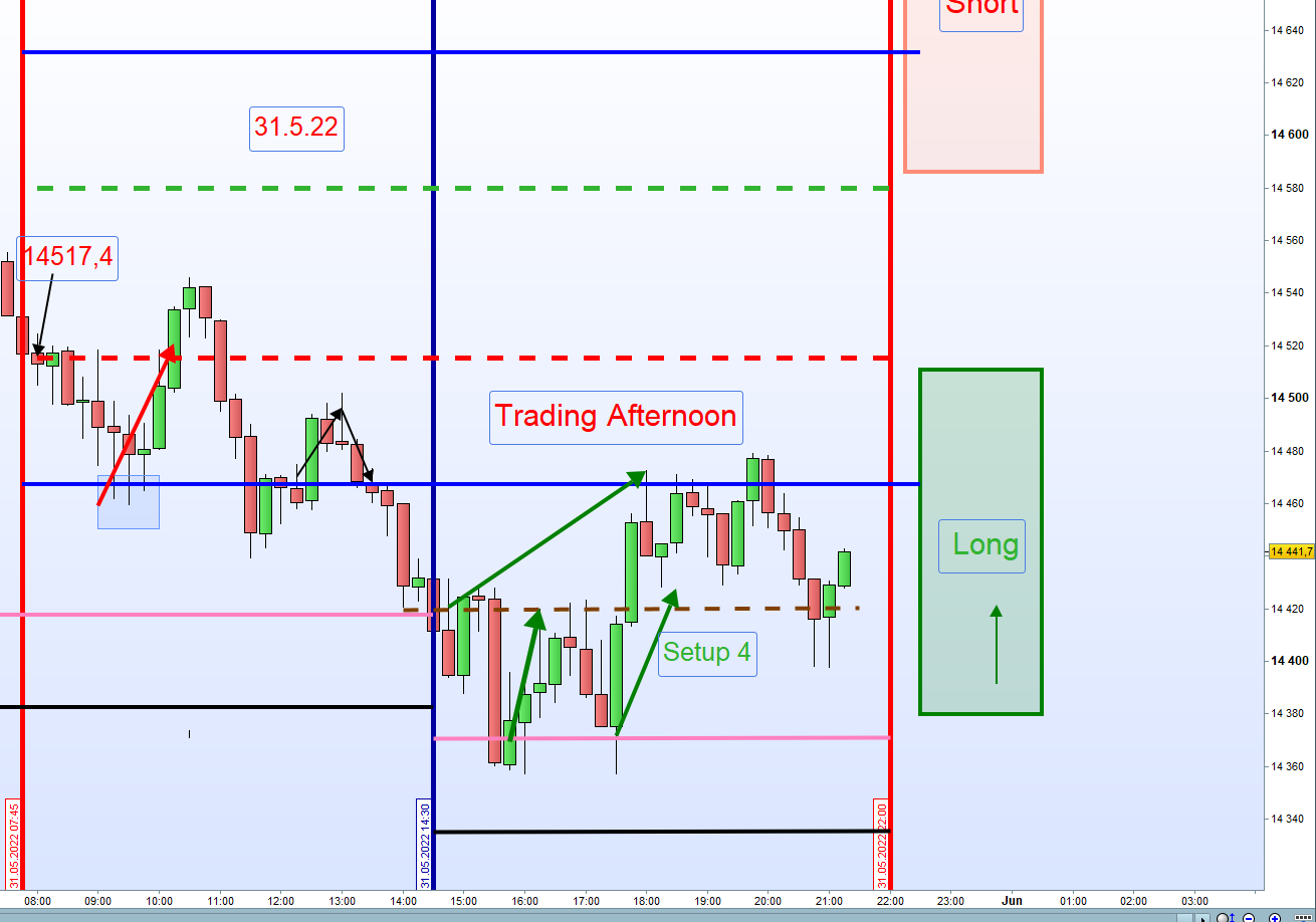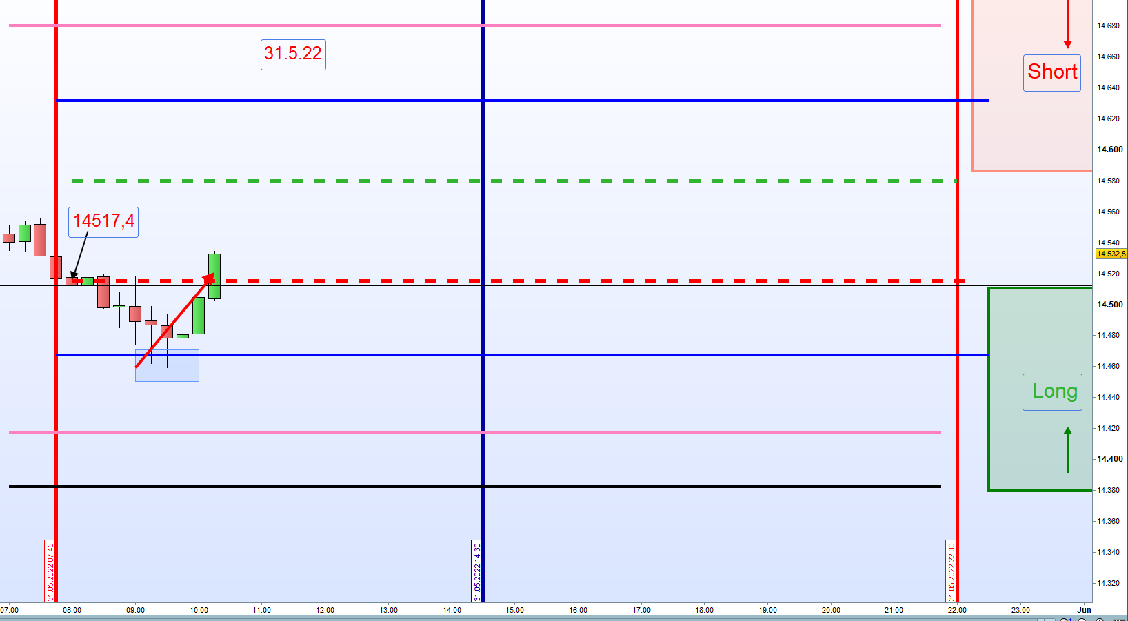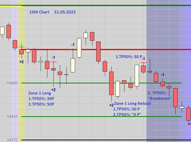 Grundsätzlich werden bis 14:30h Long Positionen gehandelt. Der Einstieg unterliegt strengen Kriterien: Sofortiger Einstieg Long um 8:00h wenn DOW Futures und FDAX positiv notieren oder auch steigender Kurs über dem Close vom DAX (XETRA) um 17:30h Vortag. Sind diese Voraussetzungen nicht gegeben, dann zuerst Eröffnung der Börse um 9:00h und Long Umkehrkerze abwarten. Dieser Einstieg ist dann die erste Zone Long. Teilgewinne (TP) zum Beispiel mit 30-50 Punkten, je nach Volatilität, können auch realisiert werden. Bei Rücksetzer kann Aufstockung erfolgen. An zweiter Zone Long Verdopplung der Position.