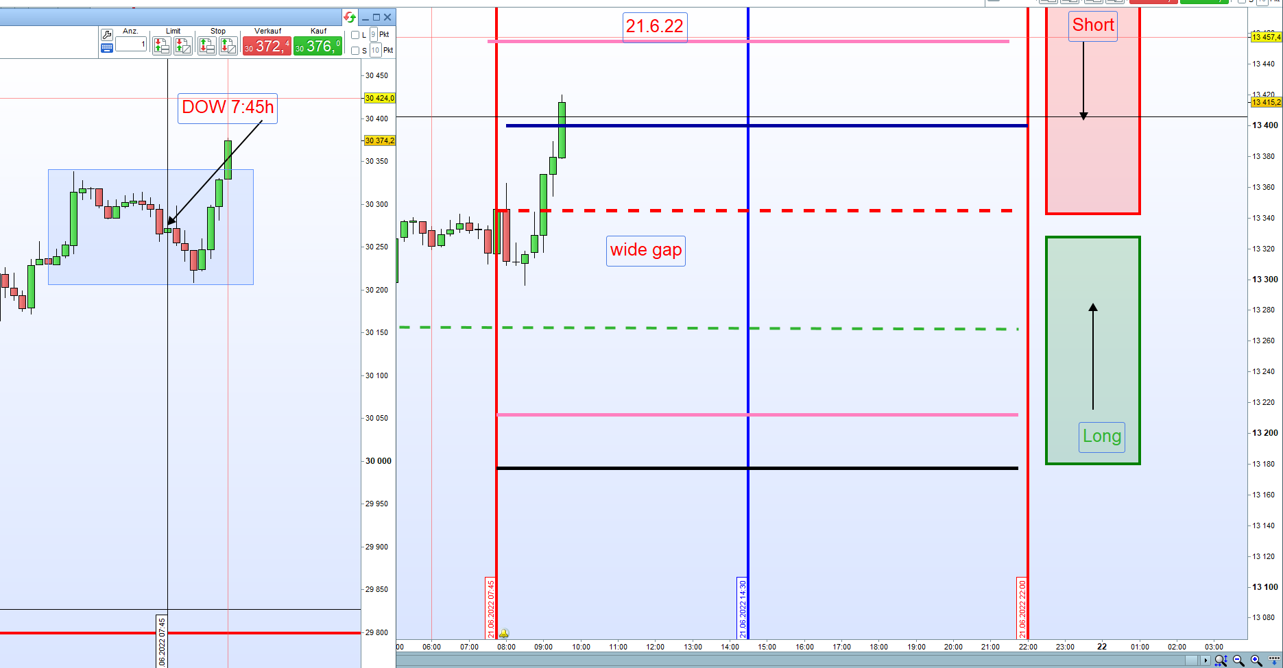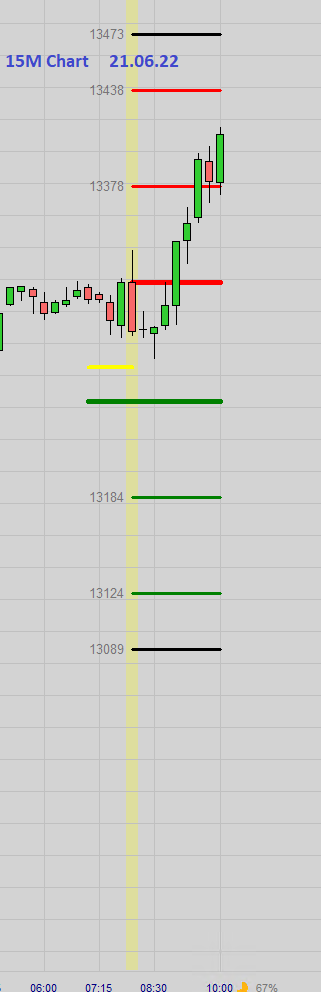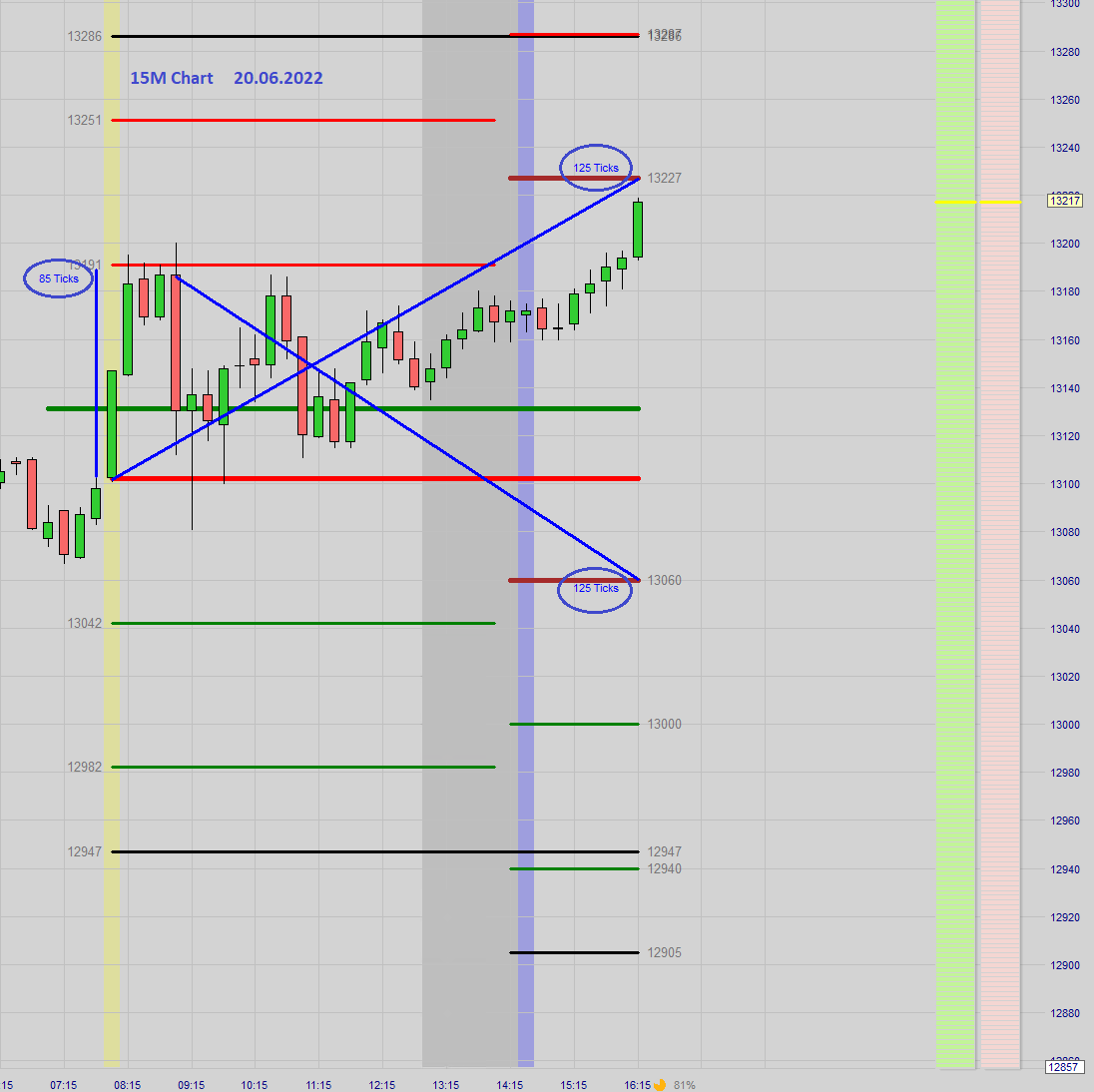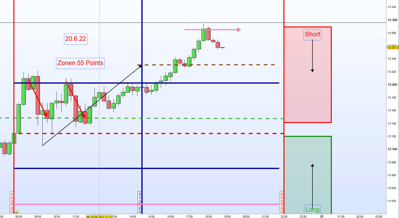 Zonen sind Short: 13394.5 mit Stop bei 13429.5 und long bei 13206.6 und 13151.6 mit Stop bei 13116.6