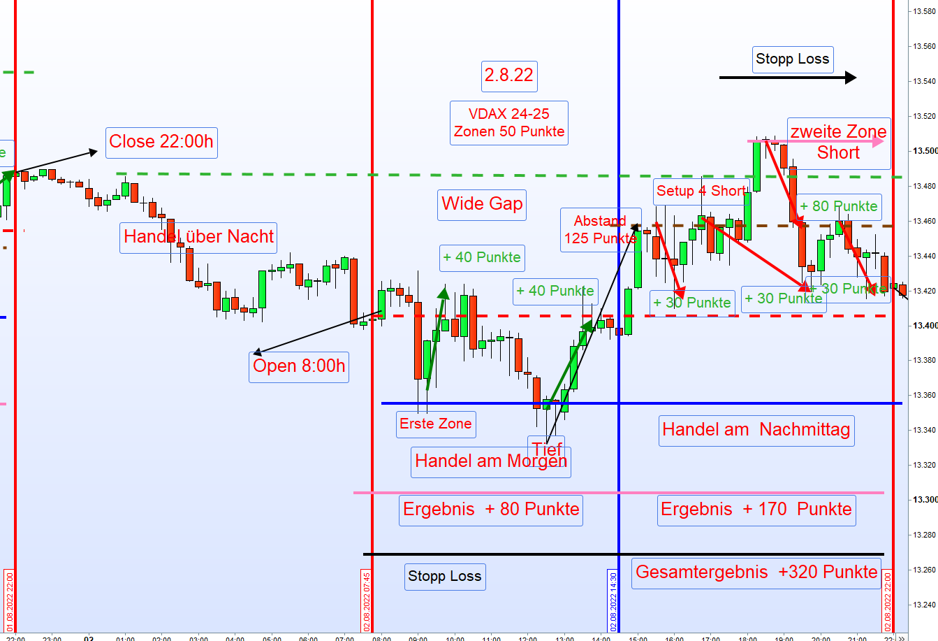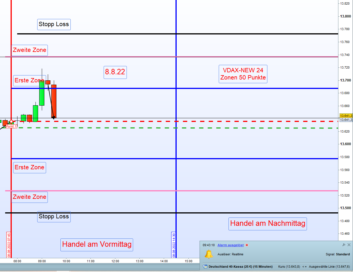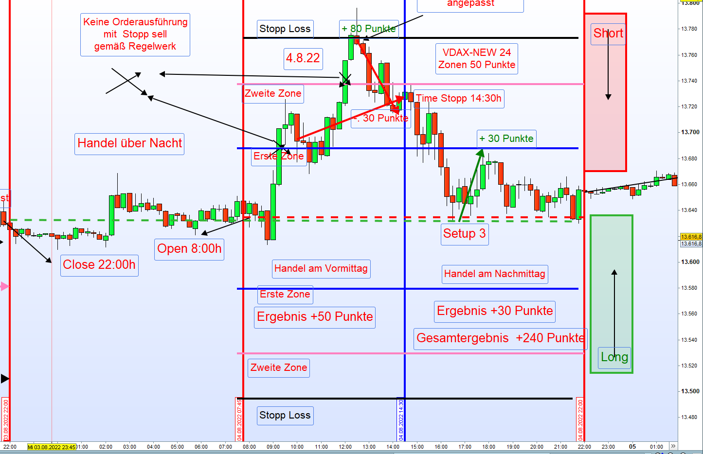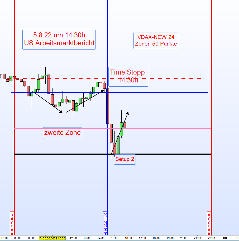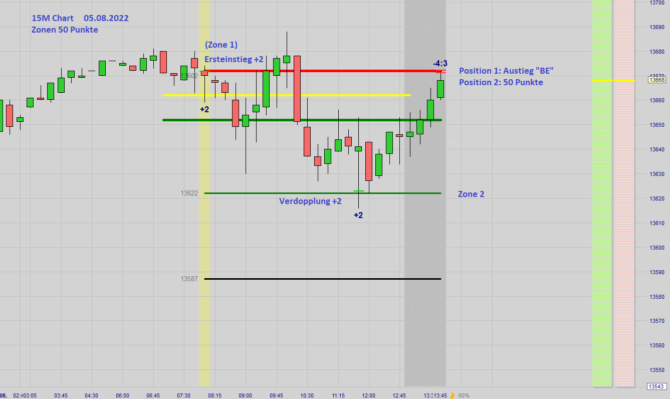 Siehe den Chart vom 1.8.22. Nach exakter Auslegung der Regel wäre die Shortposition am Tageshoch um 14:30h mit 3-5 Punkten mit Time Stopp glatt gestellt worden.