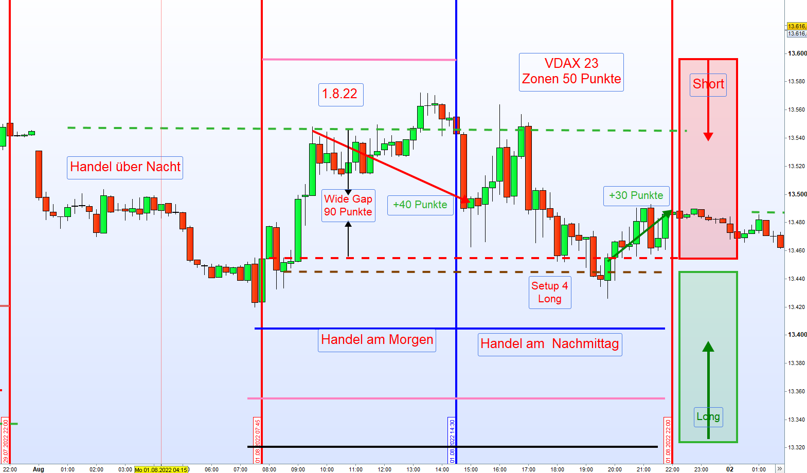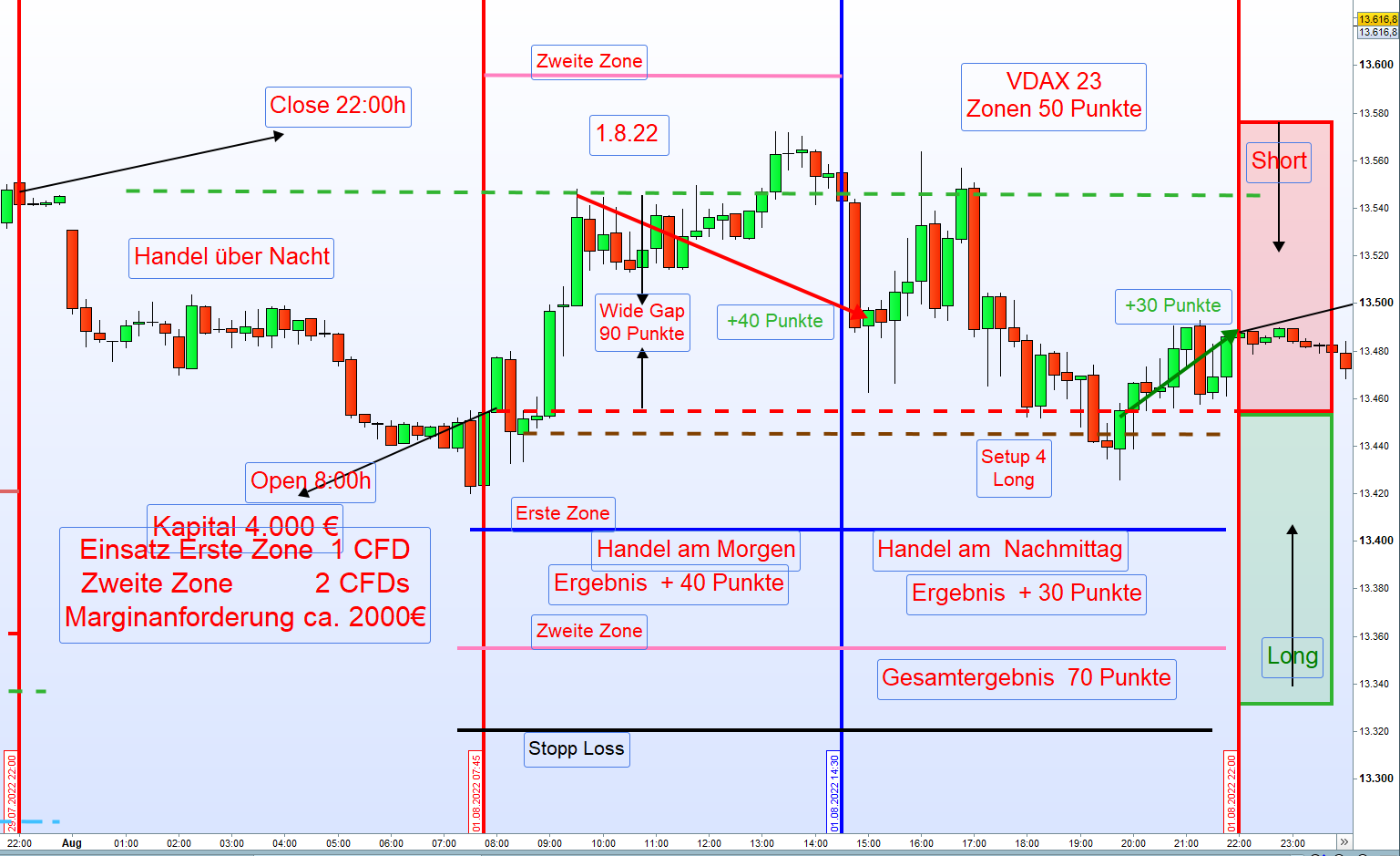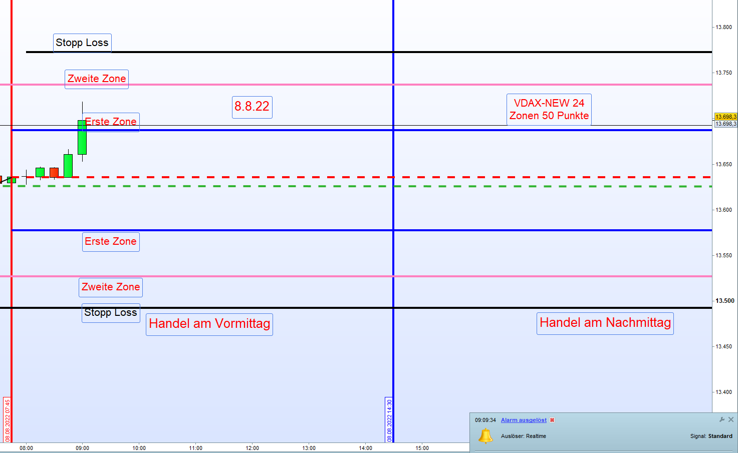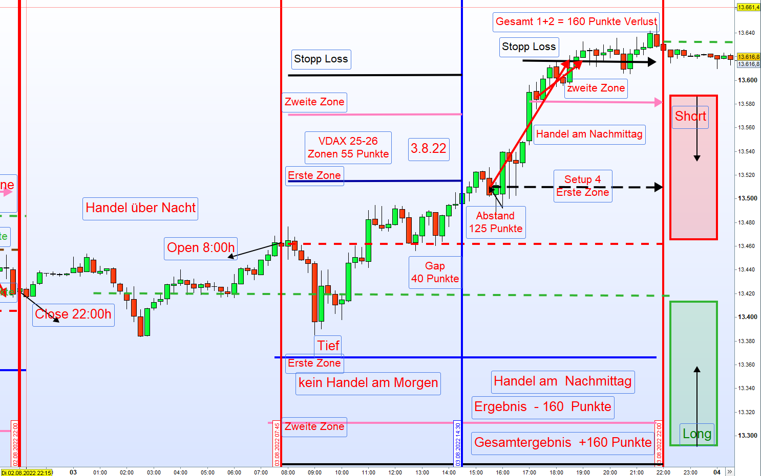 Siehe den Chart vom 1.8.22. Nach exakter Auslegung der Regel wäre die Shortposition am Tageshoch um 14:30h mit 3-5 Punkten mit Time Stopp glatt gestellt worden.